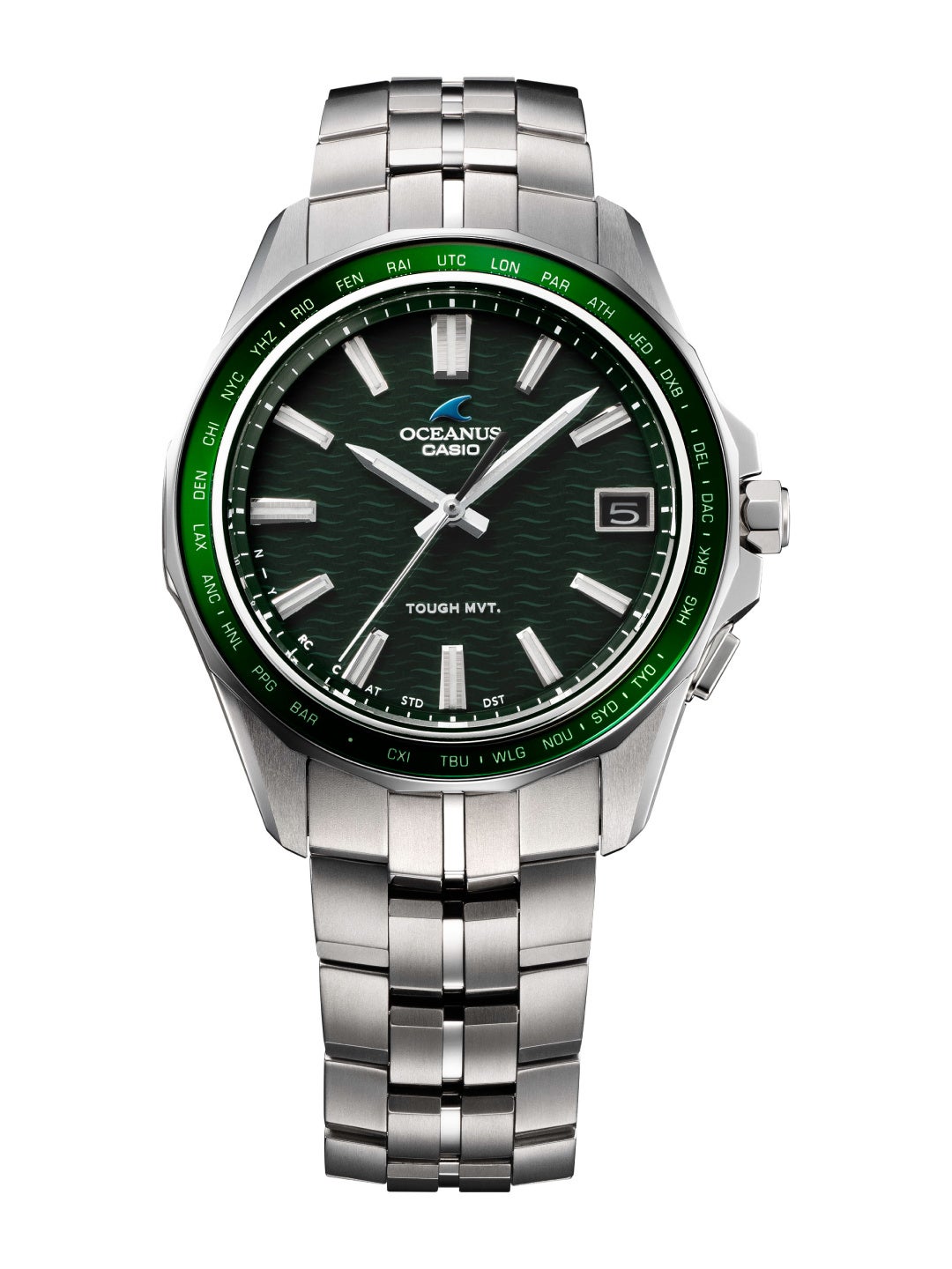 今回ご案内します『OCW-S400』は、“OCEANUS Manta”初となる3針フェイスに上質な仕上げを施し、美しさと視認性を実現した薄型メタルウオッチです。ミラー仕上げの文字板には、さざ波が作り出す水面の模様を表現したテクスチャーをあしらいシンプルながら“OCEANUS”の持つ海のイメージを演出しています。文字板は、クラシックなブラック、“OCEANUS”ならではのブルーに加えて、グリーンをラインアップ。ベゼル上部のサファイアガラスリングには、文字板と同じ色味の蒸着を施すことで統一しました。ケースからバンドにかけた流麗なフォルムなど“OCEANUS Manta”ならではの優雅さも備えています。