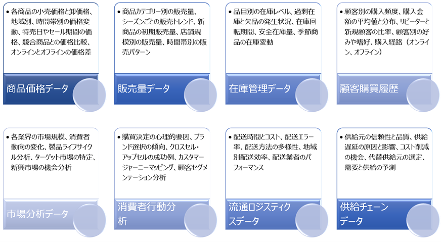 流通データは、価格、販売量、在庫管理、顧客行動、市場動向など、非常に多岐にわたる情報を含みます。さまざまな業種や商品に関連しており、多様なビジネスシーンでの応用が可能です。