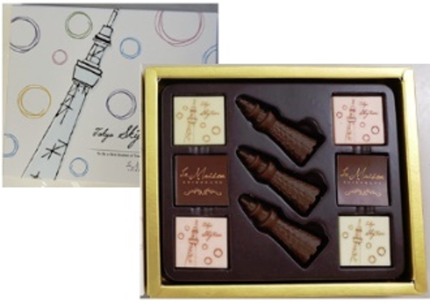 内容:手書き風のデザインを施した白のパッケージの中に、スカイツリーの形をしたミルクとホワイトのショコラやブランドロゴ、スカイツリーのイラストをプリントしたプレートショコラを詰合せました。