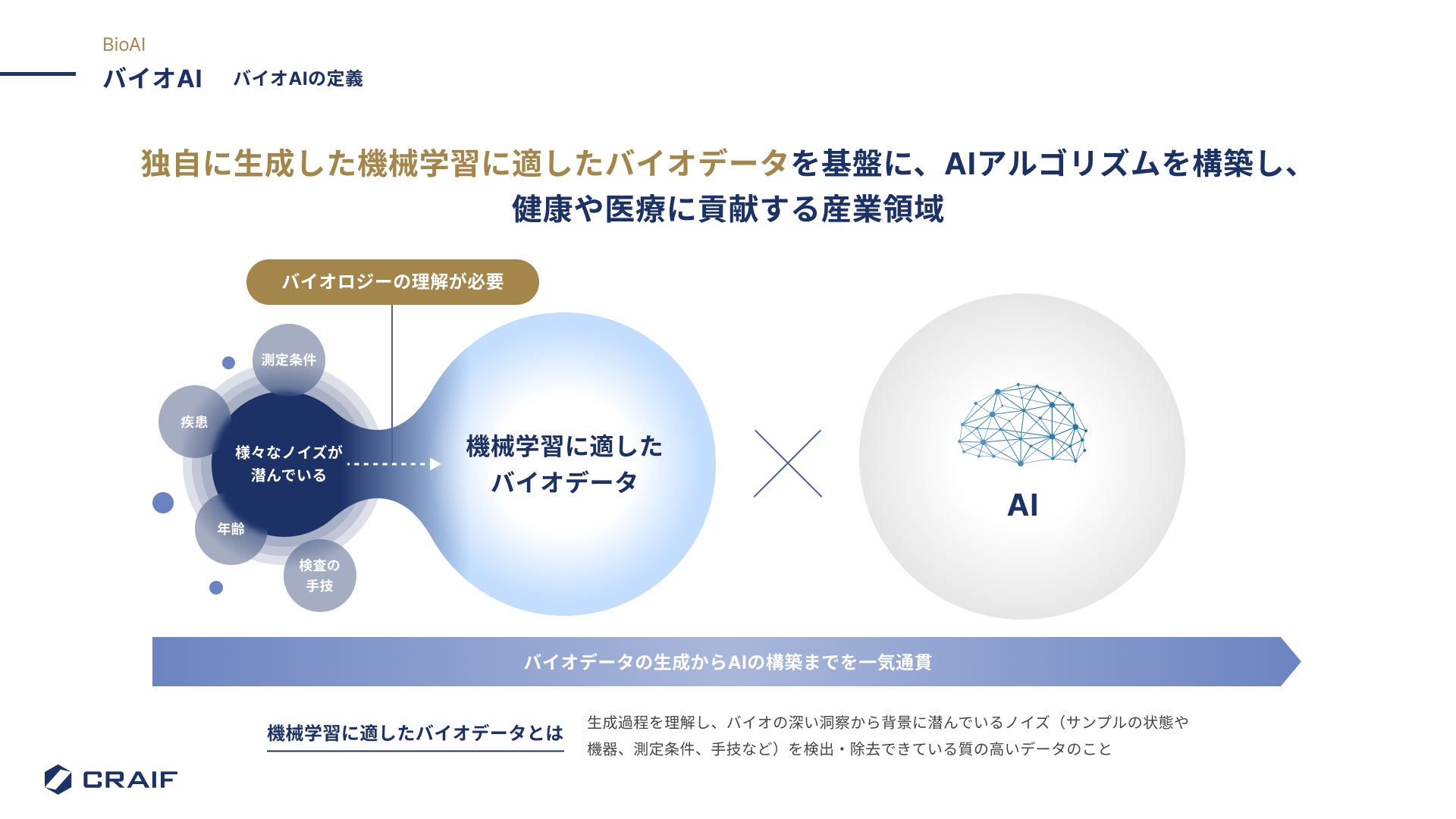 バイオAIとは、機械学習に適したバイオデータを独自に生成・解析し、AIアルゴリズムを構築することで、健康・医療分野に新たな価値を創出する産業領域です。