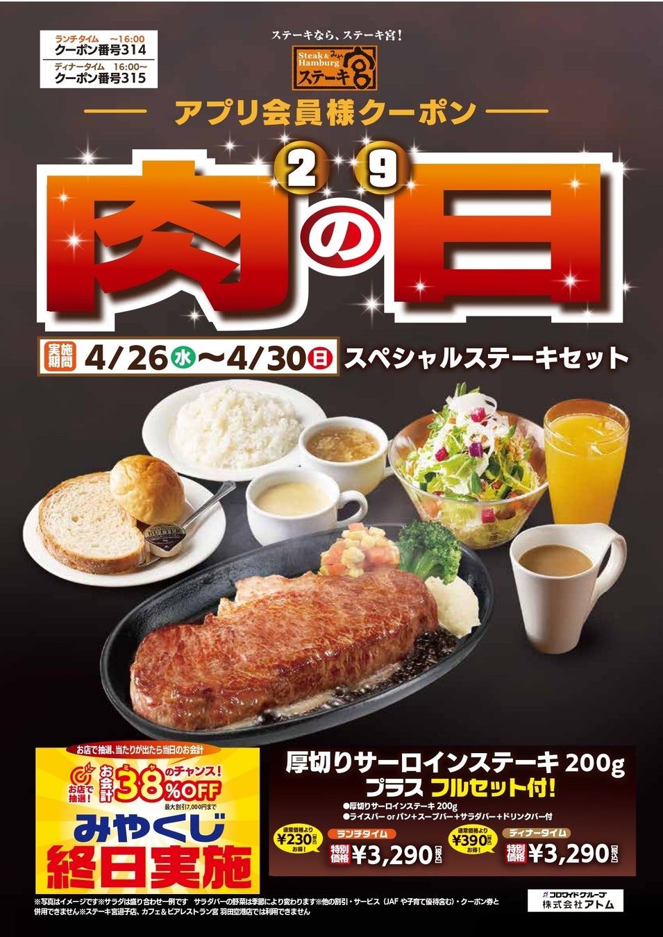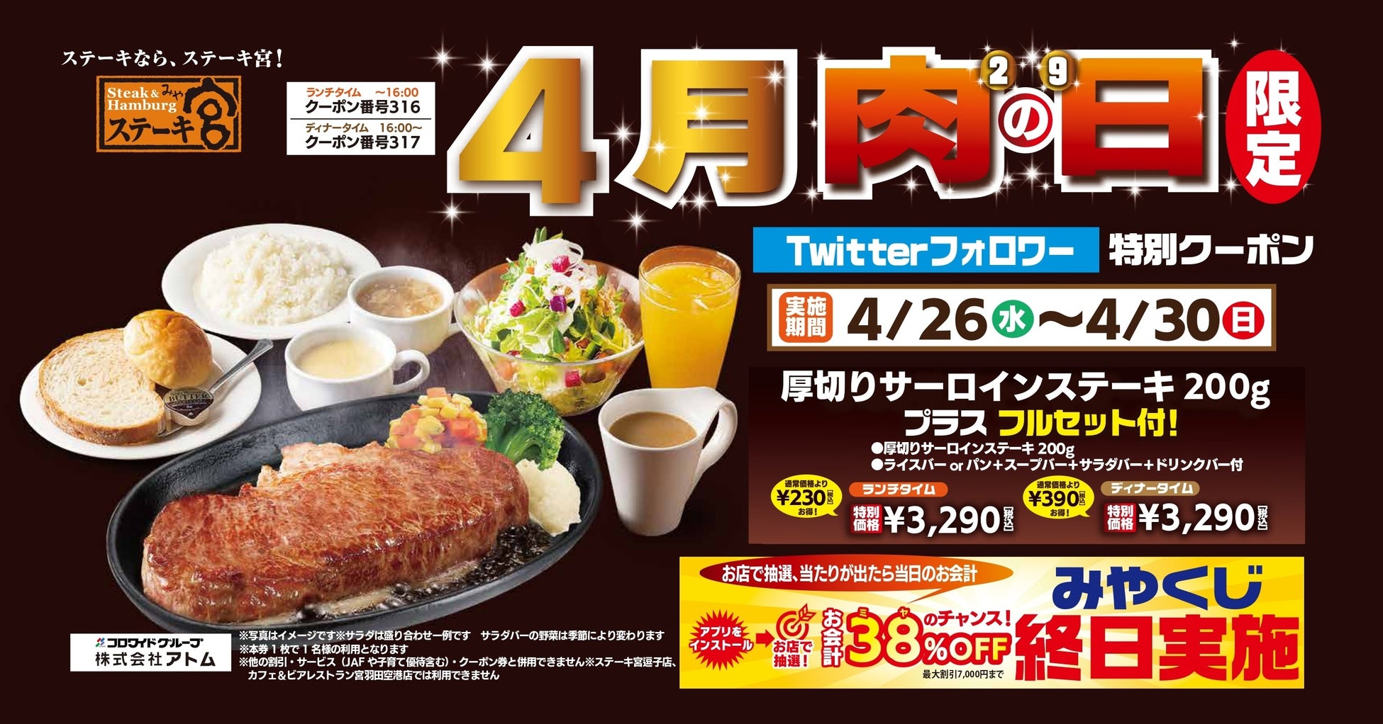 \ 4月29日は!肉の日 !/肉肉しいサーロインをスペシャルなセットで召し上がれ!アプリ会員とTwitterフォロワー限定お得なクーポンプレゼント