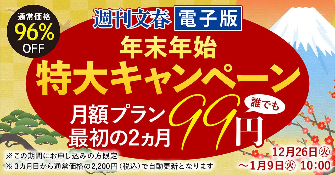 株式会社文藝春秋(本社:東京都千代田区紀尾井町 社長:飯窪成幸)は、「週刊文春」1月4日・11日の特大号発売に合わせ、「週刊文春電子版 年末年始 特大キャンペーン」を実施いたします。