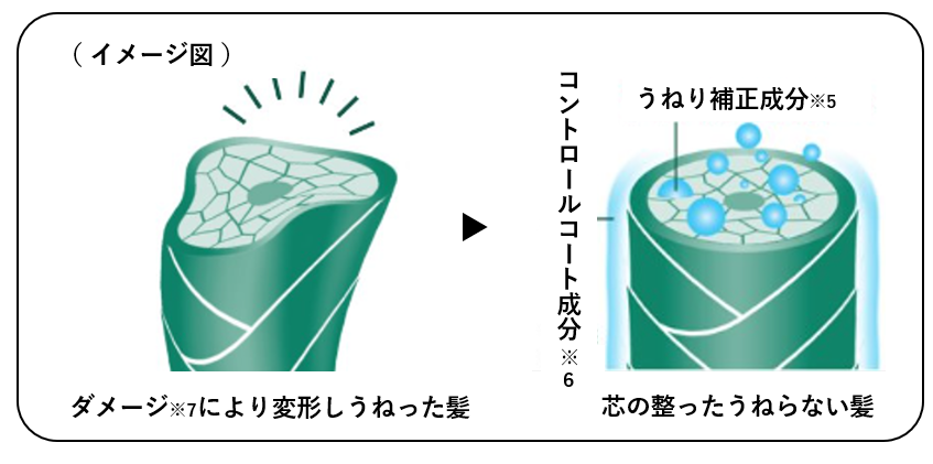 うねり補正成分※5が髪の芯に、コントロールコート成分※6が髪表面にアプローチします。ダメージ※7でうねった髪1本1本の質感を改善※8します。