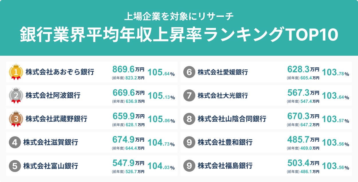 銀行業界、平均年収上昇率ランキングTOP10を発表!/SalesNow DBレポート