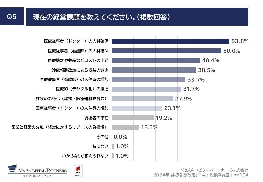「Q5.現在の経営課題を教えてください。(複数回答)」(n=104)と質問したところ、「医療従事者(ドクター)の人材確保」が53.8%、「医療従事者(看護師)の人材確保」が50.0%、「医療機器や薬品などコストの上昇」が40.4%という回答となりました。