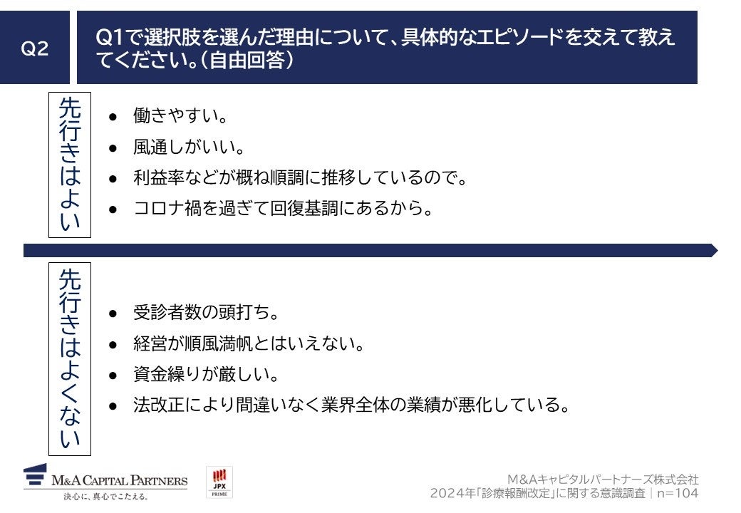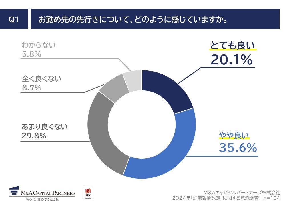 M&Aキャピタルパートナーズ株式会社(東京都中央区・代表取締役社長 中村悟)は、病院・クリニックの経営・運営を行っている経営者・役員・医療従事者104名を対象に、2024年「診療報酬改定」に関する意識調査を実施しましたので、お知らせいたします。