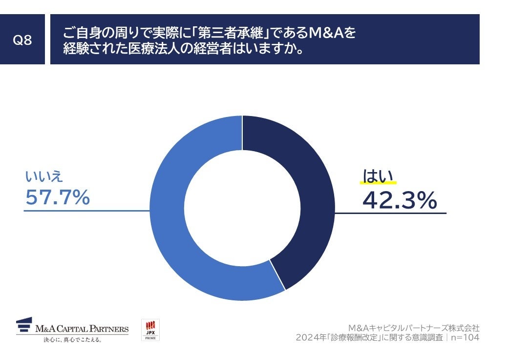 「Q8.ご自身の周りで実際に「第三者承継」であるM&Aを経験された医療法人の経営者はいますか。」(n=104)と質問したところ、「はい」が42.3%、「いいえ」が57.7%という回答となりました。