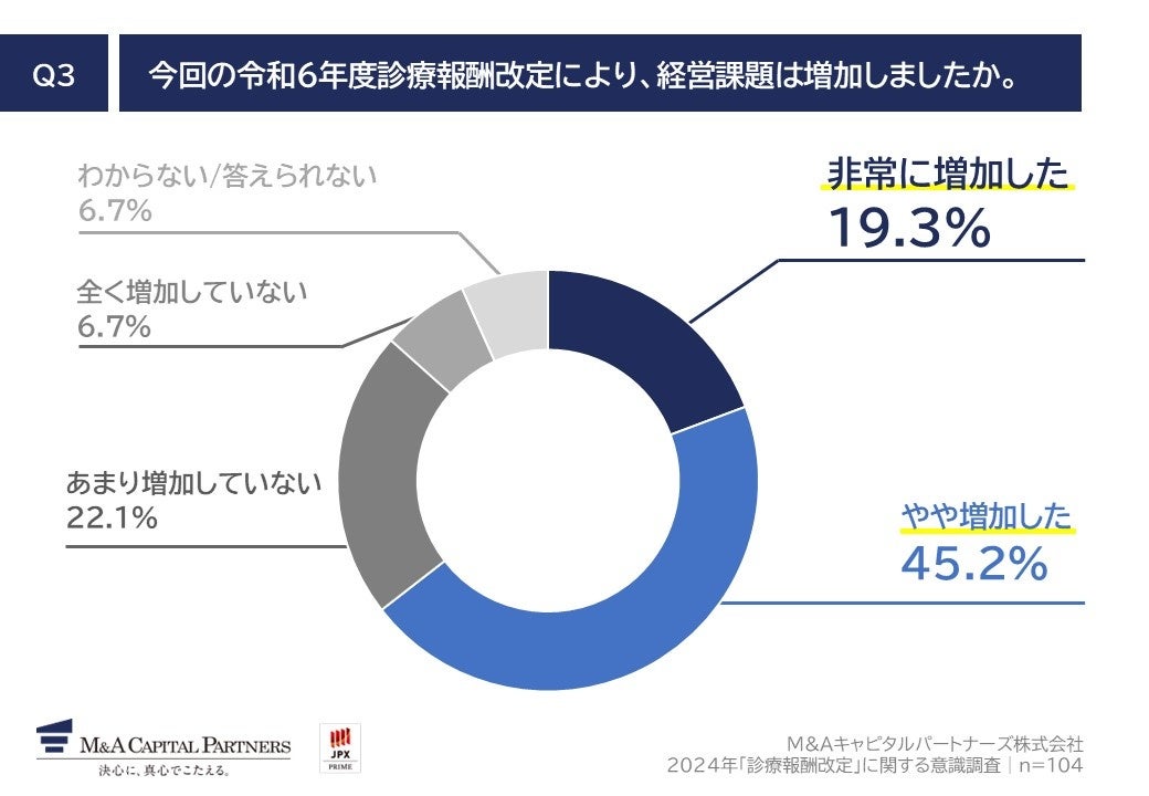 「Q3.今回の令和6年度診療報酬改定により、経営課題は増加しましたか。」(n=104)と質問したところ、「非常に増加した」が19.3%、「やや増加した」が45.2%という回答となりました。