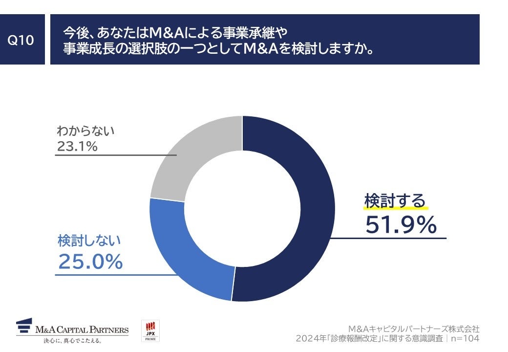 ■51.9%の医療機関が、M&Aを事業承継や事業成長の選択肢の一つとして「検討する」と回答