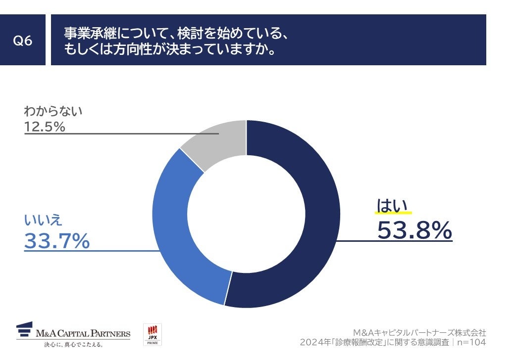 「Q6.事業承継について、検討を始めている、もしくは方向性が決まっていますか。」(n=104)と質問したところ、「はい」が53.8%、「いいえ」が33.7%という回答となりました。