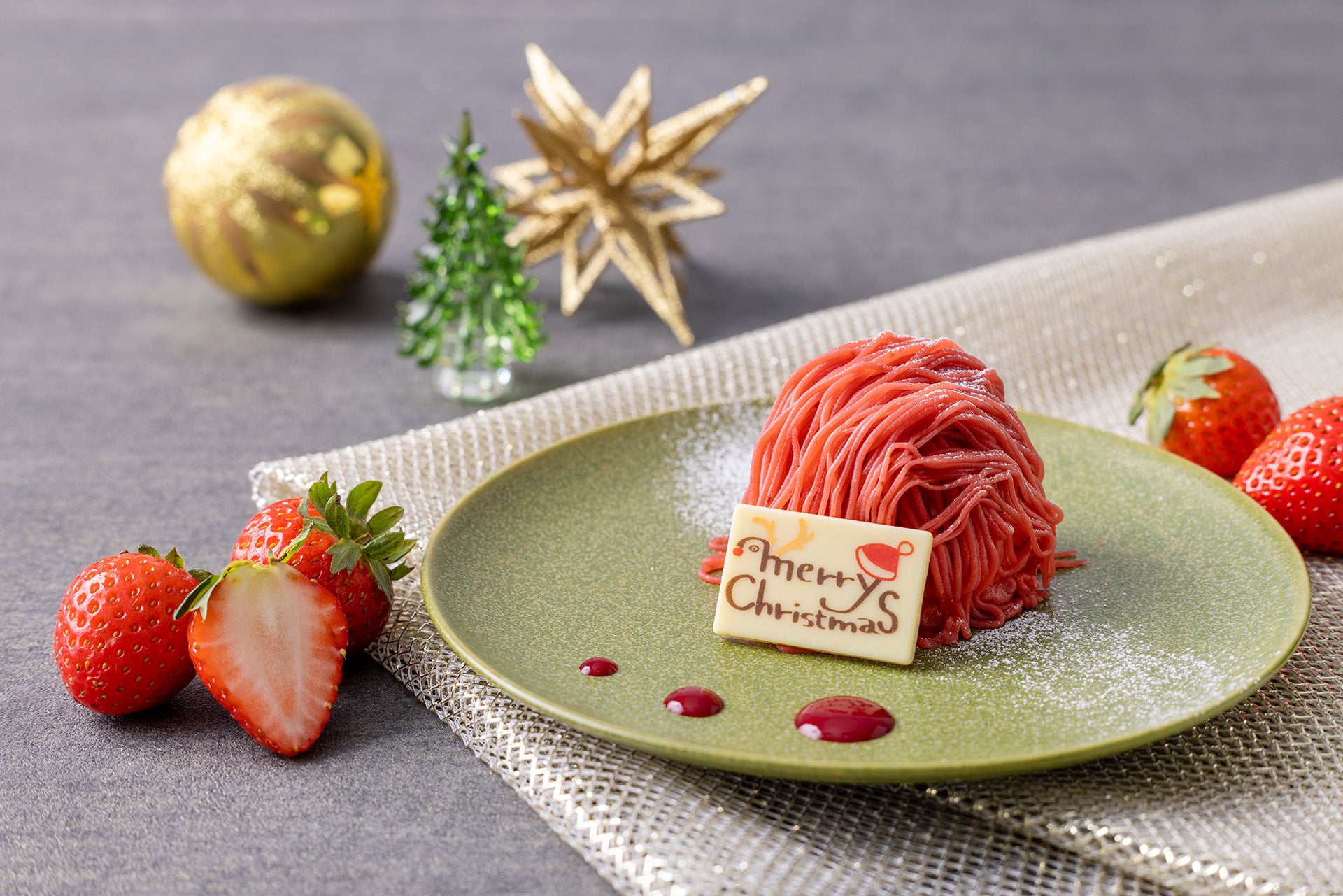 お客さまの目の前で絞る人気のモンブランが、フェスティブシーズンならではの華やかなカラーで登場。粉糖の雪化粧とプレートが、クリスマス気分を盛り上げます。