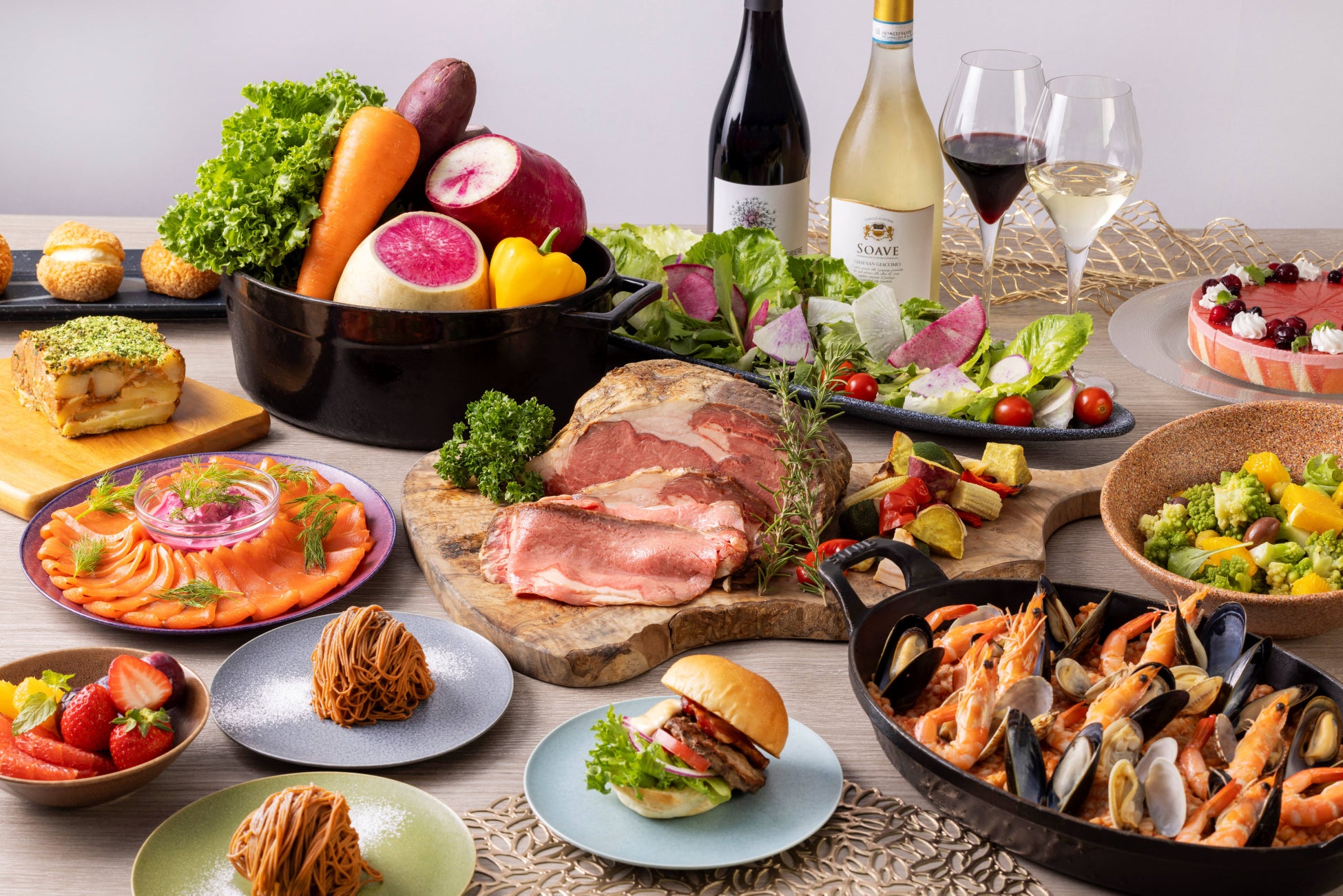 海・⼭の幸の数々と旬の食材を使用し、食材本来の自然な味わいを引き出した料理を、ビュッフェスタイルで提供します。彩り豊かで華やかな一品やその土地の文化を感じる一品など、季節ごとにさまざまなメニューを用意。さらにディナータイムでは、ビールやワイン、日本酒、焼酎などアルコールを含むドリンクなどがフリーフローで楽しめます。