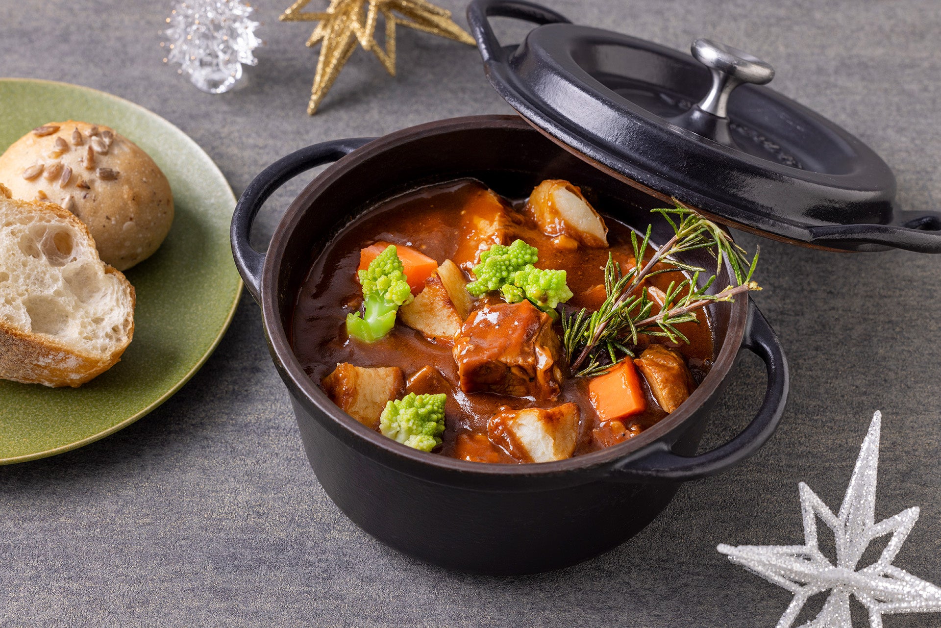 この季節に食べたくなる、やわらかく煮込まれたビーフのうまみたっぷりの、あったかシチュー。赤ワインを加えた濃厚なデミグラスソースにごろごろ野菜も加わり、ボリューム満点の一品です。