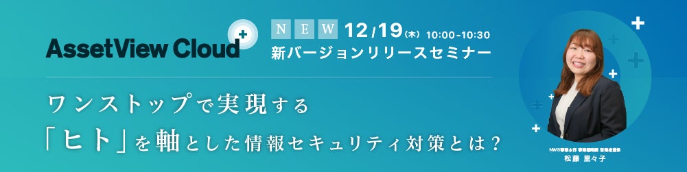 この度、「AssetView Cloud + 新バージョン」についてのセミナーを開催いたします。本セミナーでは、AssetView Cloud + の全体像から、「ヒト」起点で管理する手法について強化された機能を分かりやすく解説いたします。