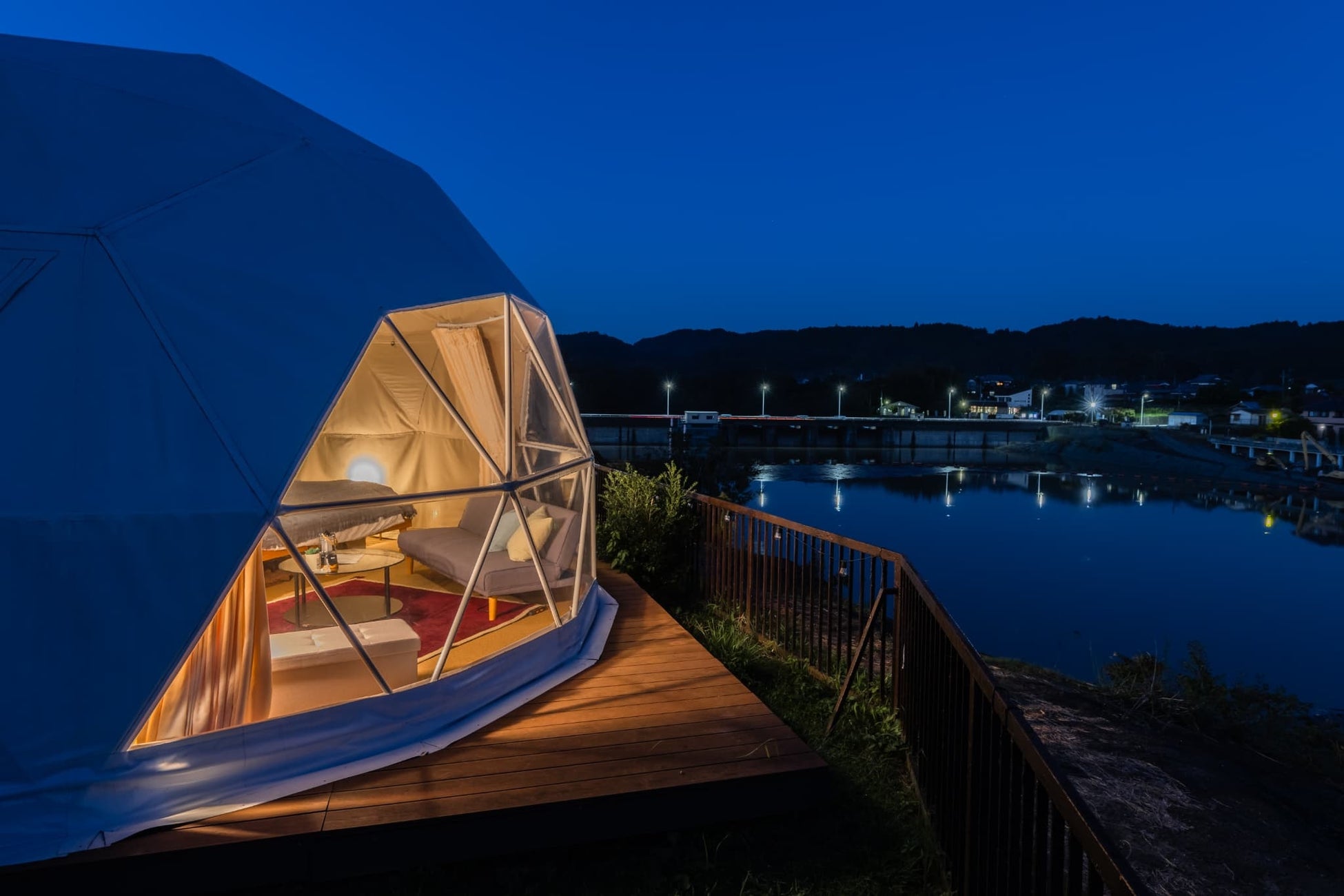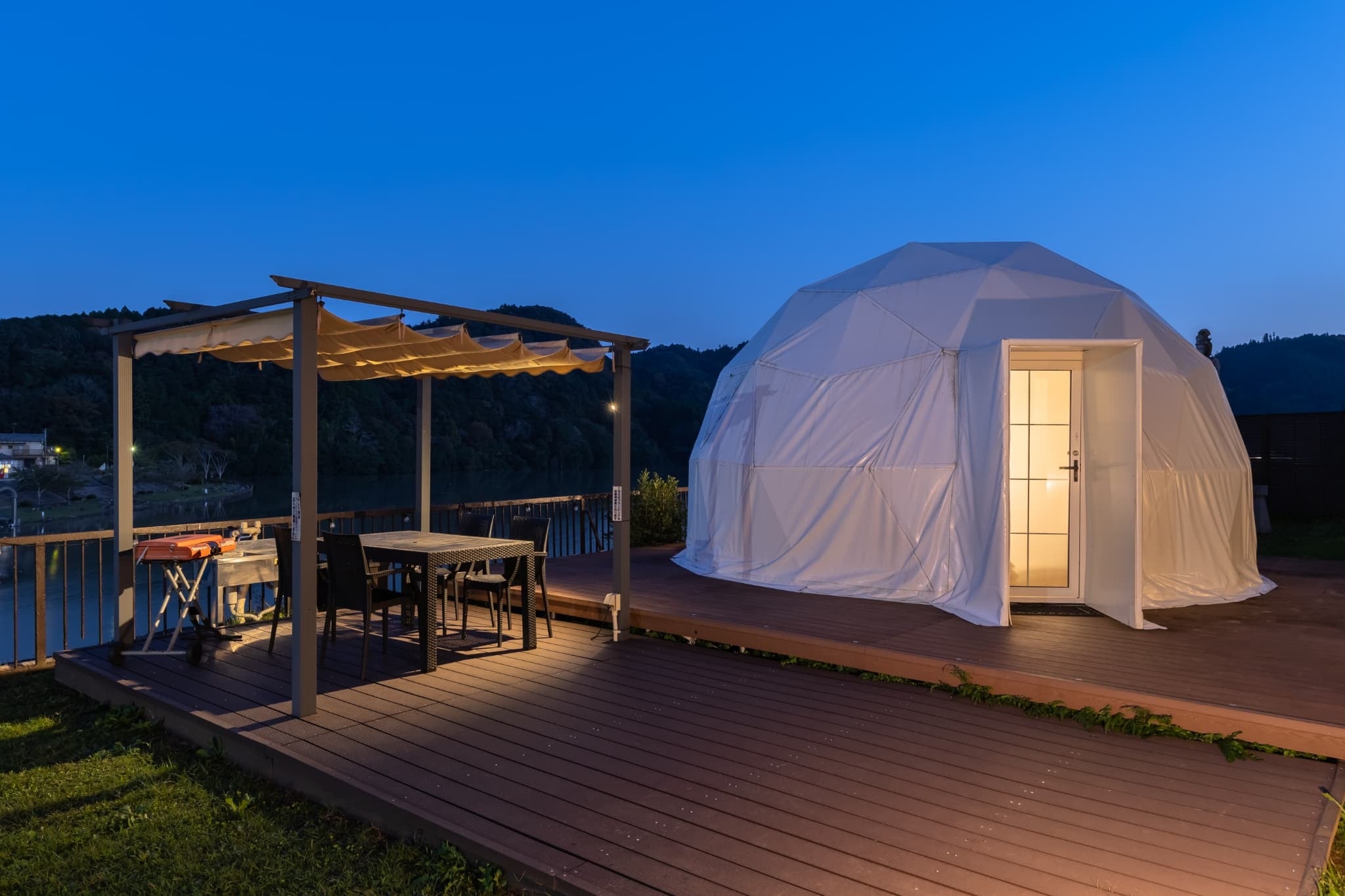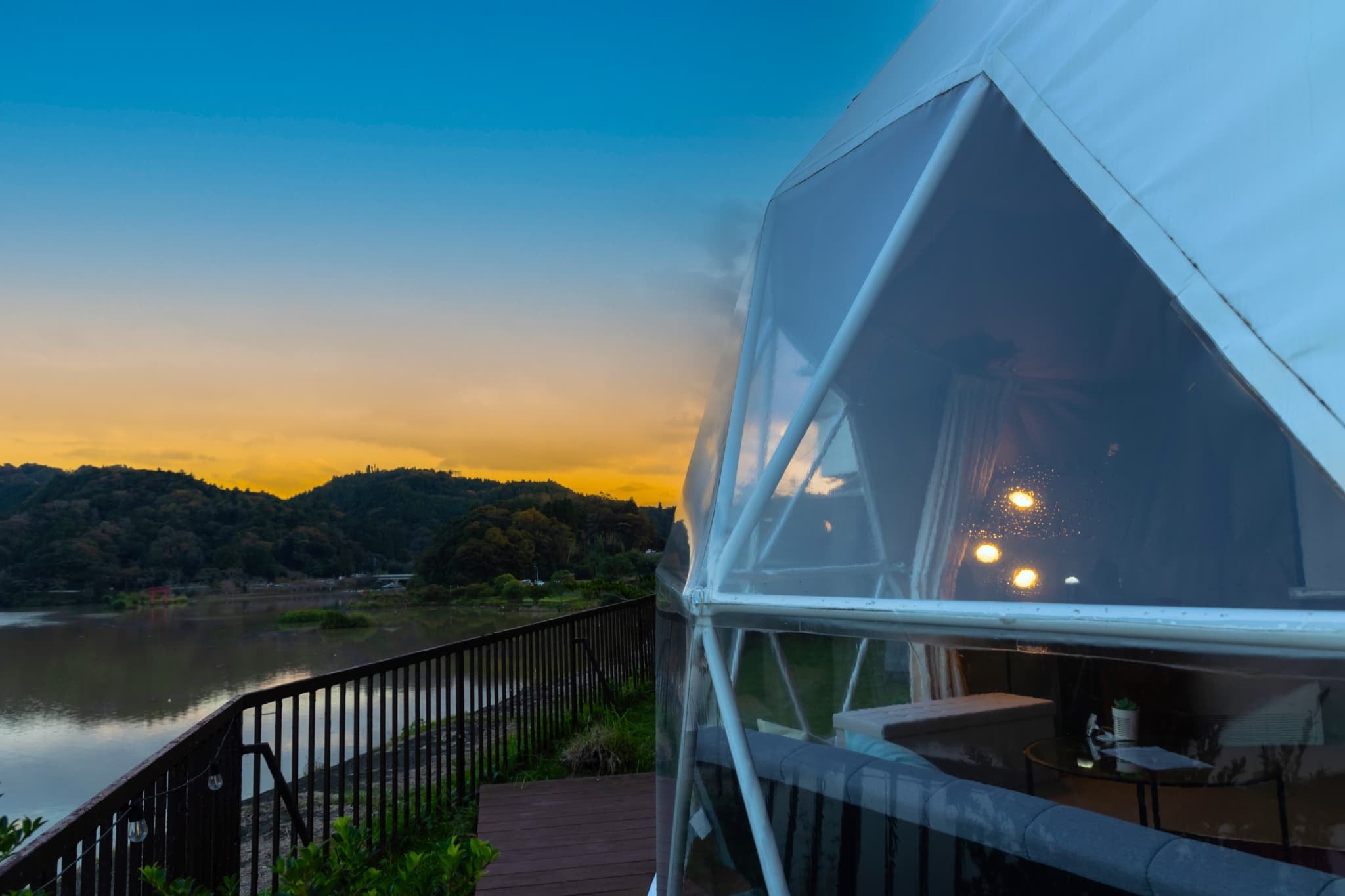 亀山湖を一望できるグランピング施設「<1組限定>湖畔リトリートグランピング 亀山温泉」新プラン販売開始/リゾートグランピングドットコム