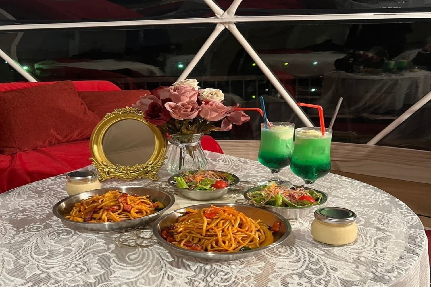 夕食は、大正ロマンな喫茶店で出されているナポリタンを完全再現してご提供いたします。シャキシャキの新鮮野菜サラダや、ほろ苦いカラメルとやさしい味がマッチした昔ながらのプリンも一緒にご賞味ください。また、レトログランピングプラン限定で「ペンダント」や「手鏡づくり」をオプションにてご体験いただけます。(別途有料)