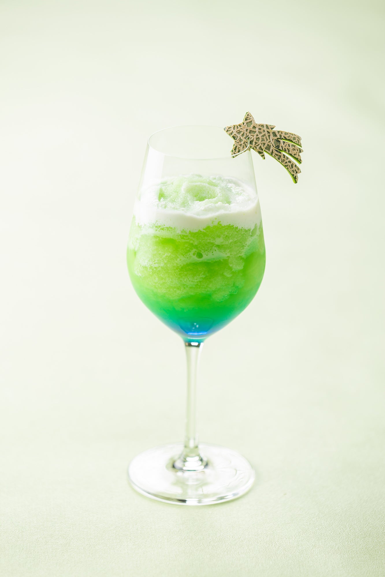 「メロン プラネット スター-Melon Planet Star-」は、フレッシュメロンを使用し、オレンジジュースとレモンジュースの爽やかな酸味と、フレッシュクリームの滑らかな口当たりがバランスよく調和した一杯です。ブルーキュラソーシロップで美しい層をつくり、メロンで流れ星の飾り切りを添えて、惑星を彷彿させるフォトジェニックなモクテルに仕上げました。
