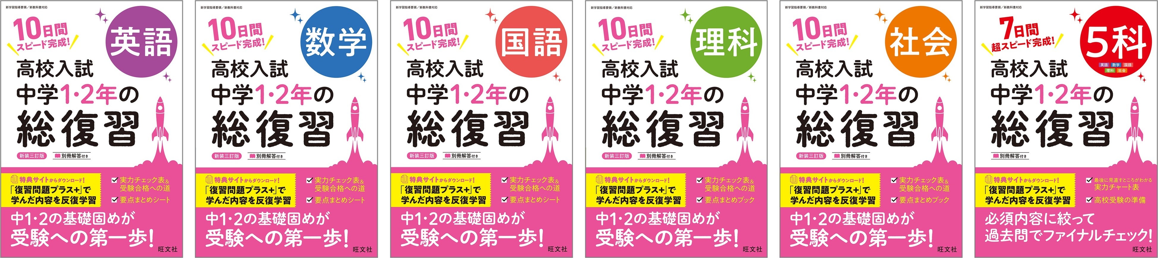 高校入試対策のスタートに最適な『高校入試 中学1・2年の総復習』シリーズに『5科』が新たに登場! 『英語/数学/国語/理科/社会』も装いを新たに計6点を3月2日(月)に刊行!