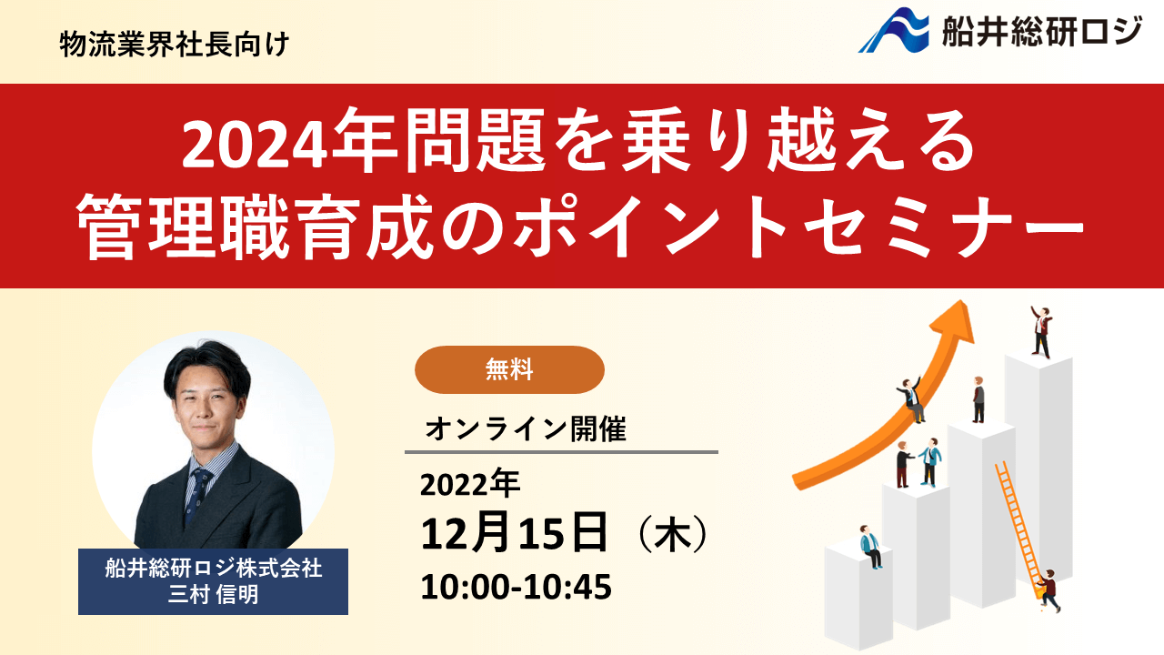ロジスティクス・物流コンサルティングサービスを提供する船井総研ロジ株式会社(東京本社:東京都千代田区、代表:菅重宏、以下「船井総研ロジ」)は、2022年12月15日(木)10:00~10:45、物流企業の経営者を対象に「2024年問題を乗り越える管理職育成のポイントセミナー」をオンラインで開催いたします。