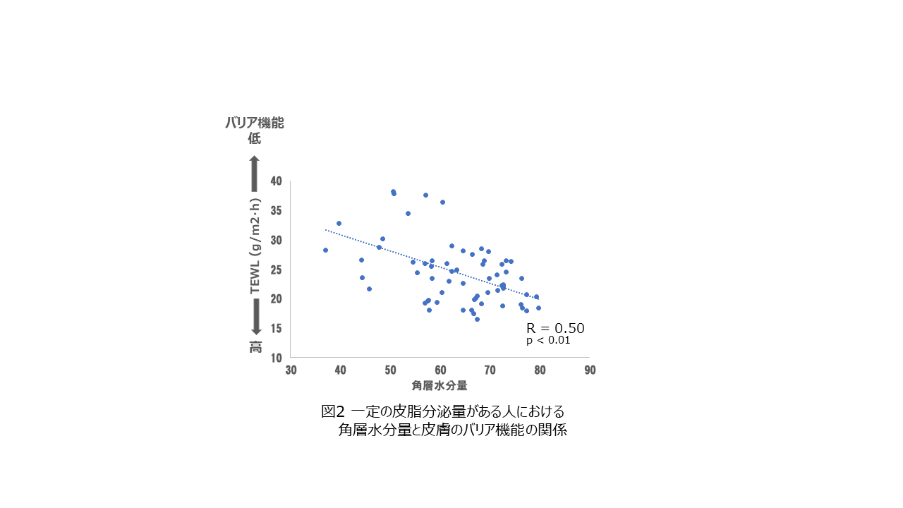 つまり、一定の分泌量があり不飽和脂肪酸の比率が高いと、バリア機能が低く角層水分量が少ないことが考えられ、このことは今回の解析により、初めて明らかになりました。一方、分泌皮脂量が少ないグループでは、これらの関係は確認できませんでした。