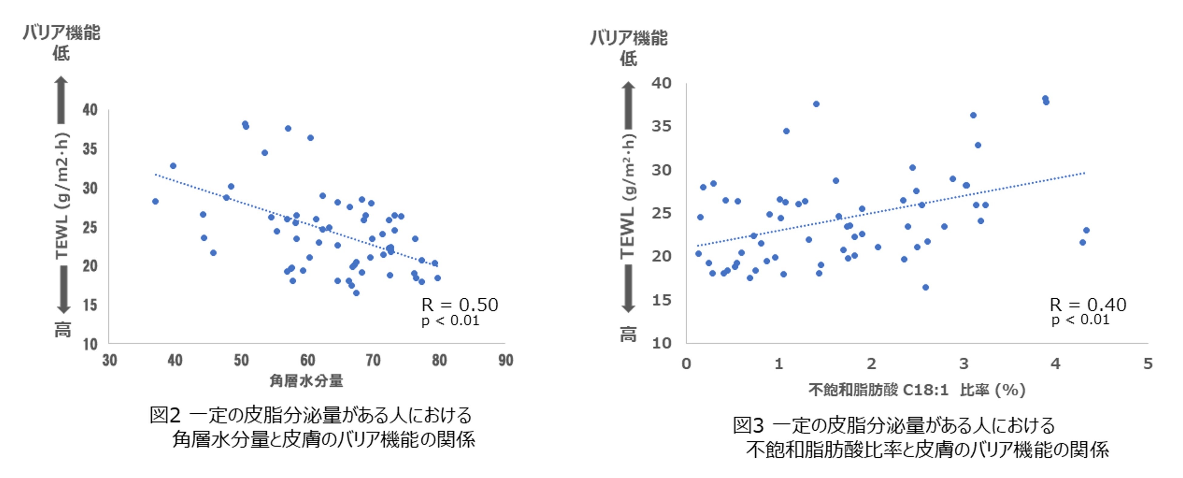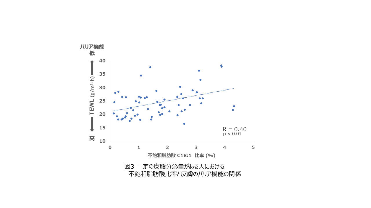 一定の皮脂分泌量がある人*3と分泌量が少ない人に分けて解析を行ったところ、一定の分泌量があるグループにおいては、バリア機能が低いと、角層水分量が少ないという関係性が明らかになりました(図2)。さらに皮脂に含まれる成分の質的な解析を進めた結果、皮脂中の不飽和脂肪酸比率が高いほど、バリア機能が低いことを確認しました(図3)。