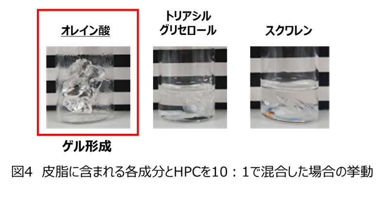 上記の知見から、皮脂に期待される保湿機能を維持しながらも、皮膚への悪影響の要因となりうる不飽和脂肪酸を低減させるための技術が必要だと考えました。そこで花王は、不飽和脂肪酸のみをゲル化し、トラップする技術の開発に取り組みました。さまざまなポリマーと皮脂に含まれる各成分を混合し、ゲル化するかどうかを観察した結果、ある種のHPCが、不飽和脂肪酸であるオレイン酸(OA)のみを即時的にゲル化することを見いだしました(図4)。