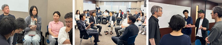 上記5名にて、既存事業の活用に向けたニーズについて、新市場先の方向性、事業モデルの構築などをポイントにCxO人材との議論やフィッシュボール方式により参加者が主体的に質問や議論に加わる場面も見られ、さまざまな議論が交わされました。グループディスカッションでは5つのグループに分かれ、参加者それぞれのバックボーンの知見や技術によるアドバイス、強み・課題の再整理、新市場の可能性探求などが行われ、会場は終始活気に満ちていました。