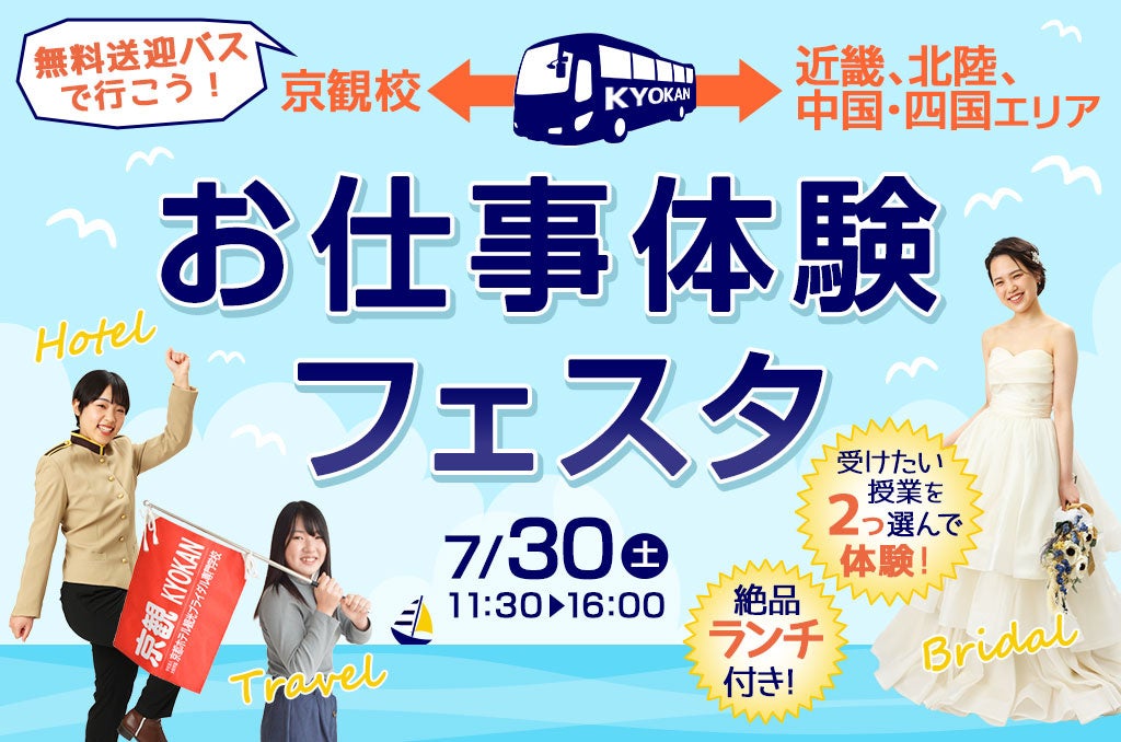 京都ホテル観光ブライダル専門学校は、2022年7月30日(土)にオープンキャンパス「お仕事体験フェスタ」を開催します。今回のオープンキャンパスでは遠方の方も気軽に参加できるよう、JR福井駅・敦賀駅・長浜駅・彦根駅・草津駅・西舞鶴駅・綾部駅・福知山駅・坂出駅・岡山駅・高松駅・徳島駅・豊岡駅・丹鉄峰山駅・丹鉄宮津駅、洲本ICからの無料送迎バスを運行します。また、京都市内高級ホテルと企画した京観オリジナルお弁当付きの特別イベントです。