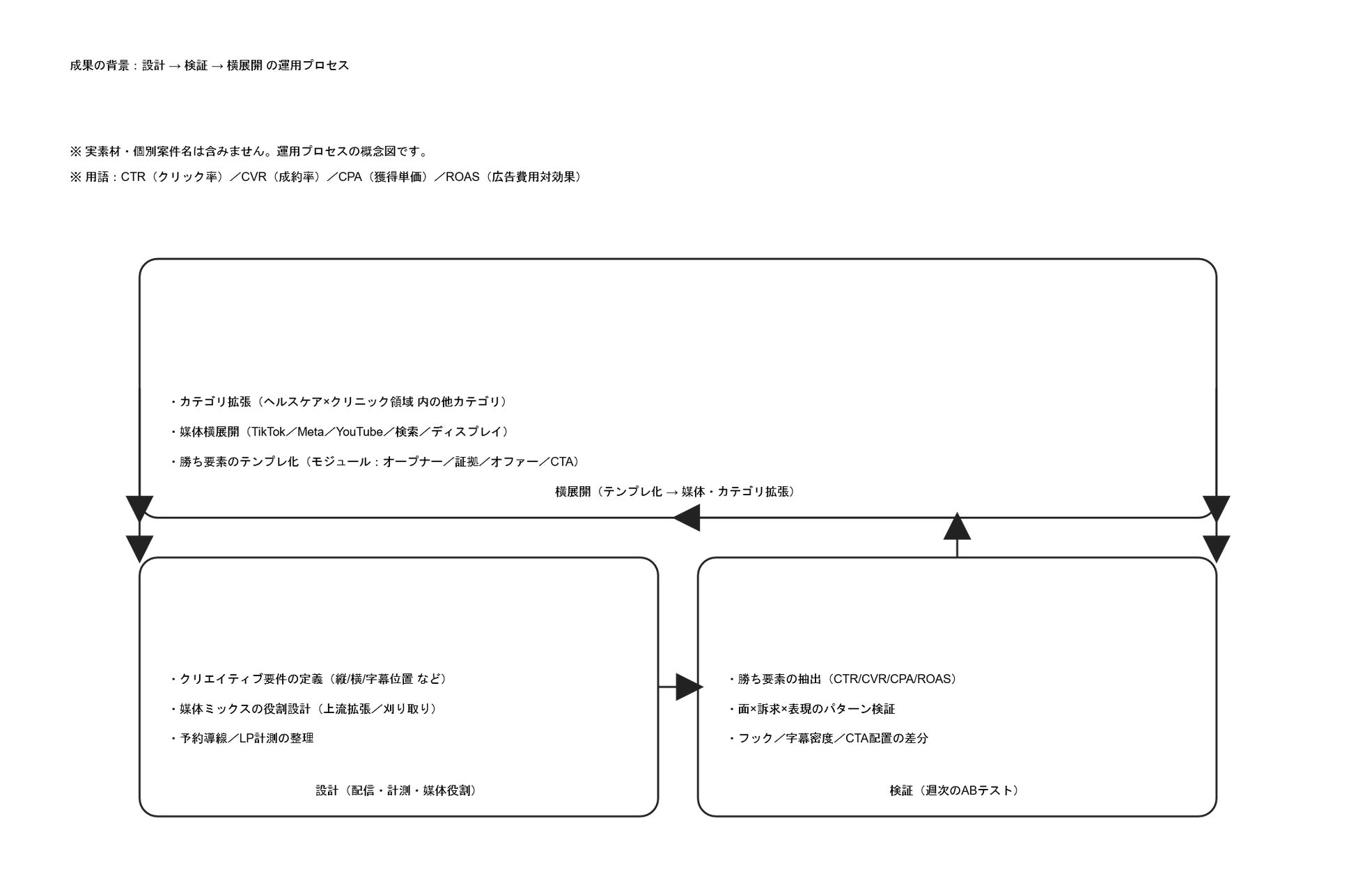 ・週次検証サイクル:面・訴求・表現をABテストで更新し、学習の連続性を維持。