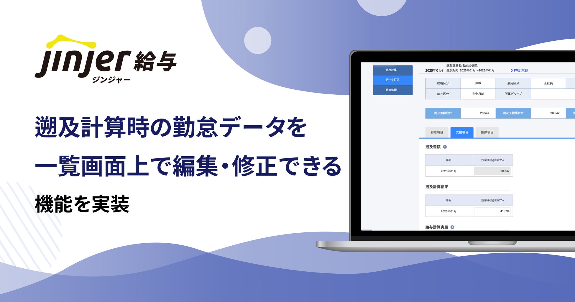 クラウド型人事労務システム「ジンジャー」を提供しているjinjer株式会社(本社:東京都新宿区、代表取締役社長:桑内 孝志)は、「ジンジャー給与」にて、遡及計算時に勤怠データを修正し、そのデータを基に支給額や控除額を再計算できる機能を実装したことをお知らせします。