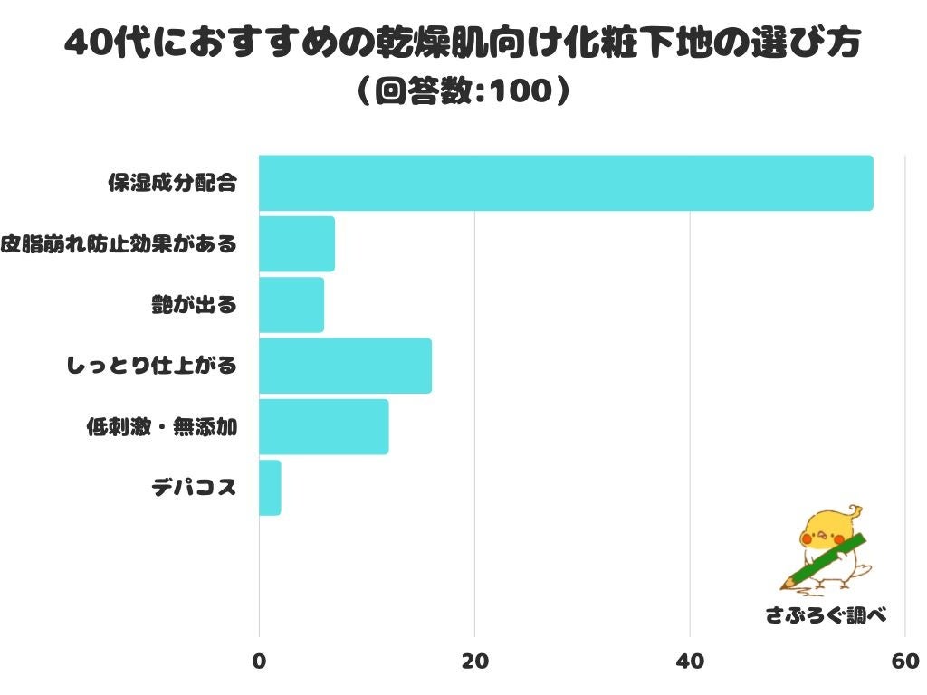 【調査レポート】40代におすすめの乾燥肌向け化粧下地の選び方は?1位は「保湿成分配合」という結果でした!