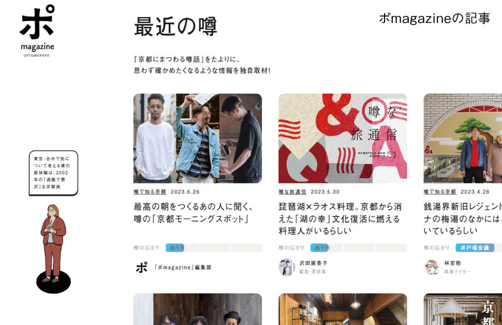 題材とするポmagazineは、京都にあふれるちまたの「噂」を集めたWEB媒体。京都を拠点とするbankto.LLCと梅小路ポテル京都の両社がガイドブックや雑誌に載るような情報ではなく、裏動線のような切り口や見えを変えて見た京都の情報を「噂」して集め、毎月打ち合わせし掲載内容を決めています。