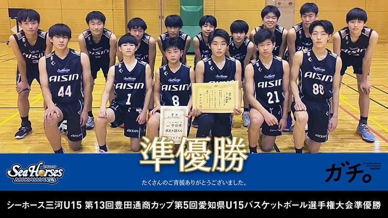 2023年10月21日(土)~11月18日(土)にかけて開催された「第13回豊田通商カップ 第5回愛知県 U15 バスケットボール選手権大会 2023」において、シーホース三河U15が準優勝しました。