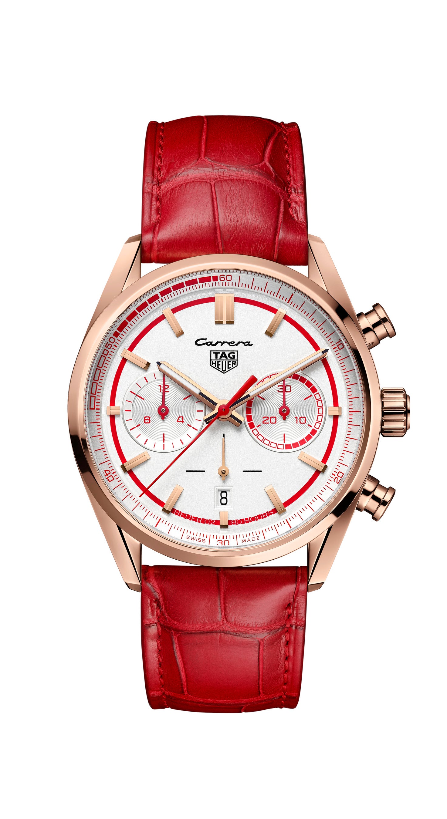 キャリバー ホイヤー02 / 自動巻き / ホワイトオパーリンダイヤル / ポリッシュ仕上げを施した18Kローズゴールド製ケース / 面取加工と二重反射防止加工を施したドーム型サファイアクリスタル / ケース径42mm / レッドアリゲーターストラップ / 世界限定250本