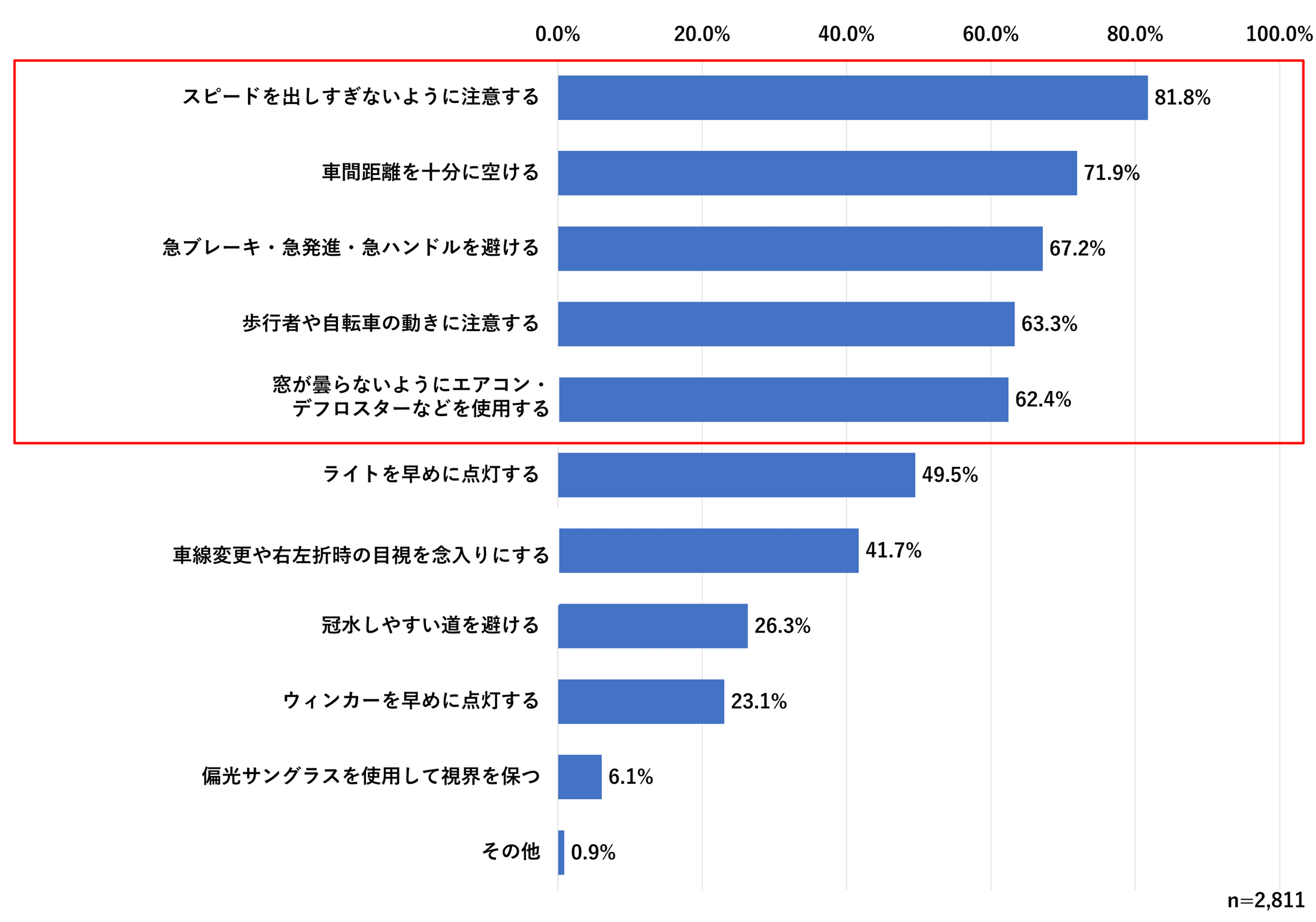 ・また、雨天時に運転する際、いつもより気をつけていることに関しては、「スピードを出しすぎないように注意する(81.8%)」「車間距離を十分に空ける(71.9%)」「急ブレーキ・急発進・急ハンドルを避ける(67.2%)」「歩行者や自転車の動きに注意する(63.3%)」「窓が曇らないようにエアコン・デフロスターなどを使用する(62.4%)」という回答が6割以上を超える結果となりました。