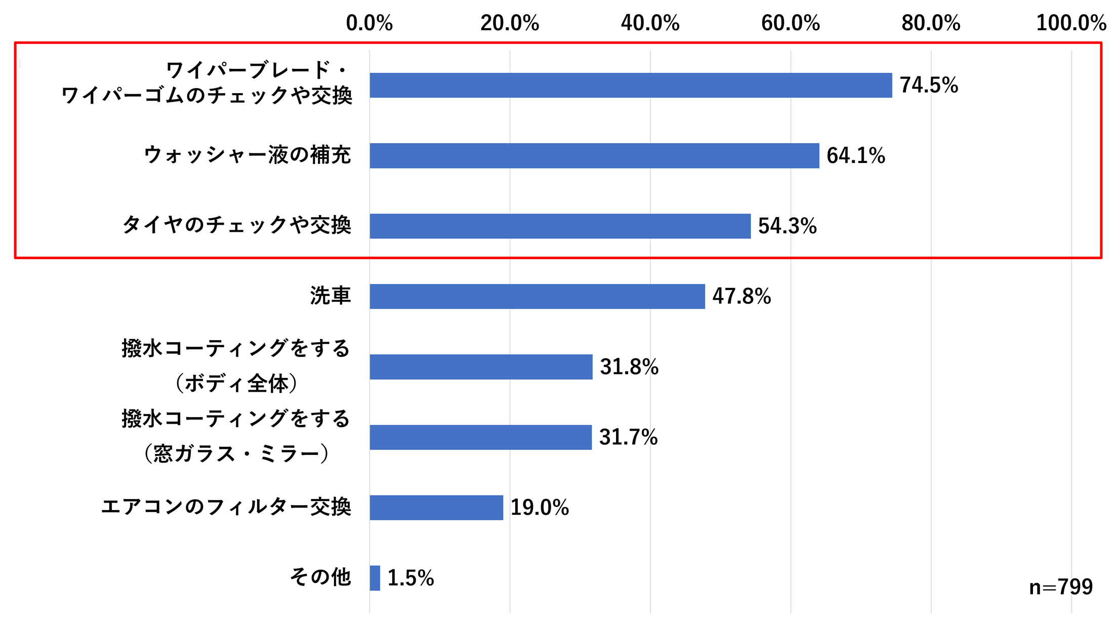 最多は「ワイパーブレード・ワイパーゴムのチェックや交換(74.5%)」