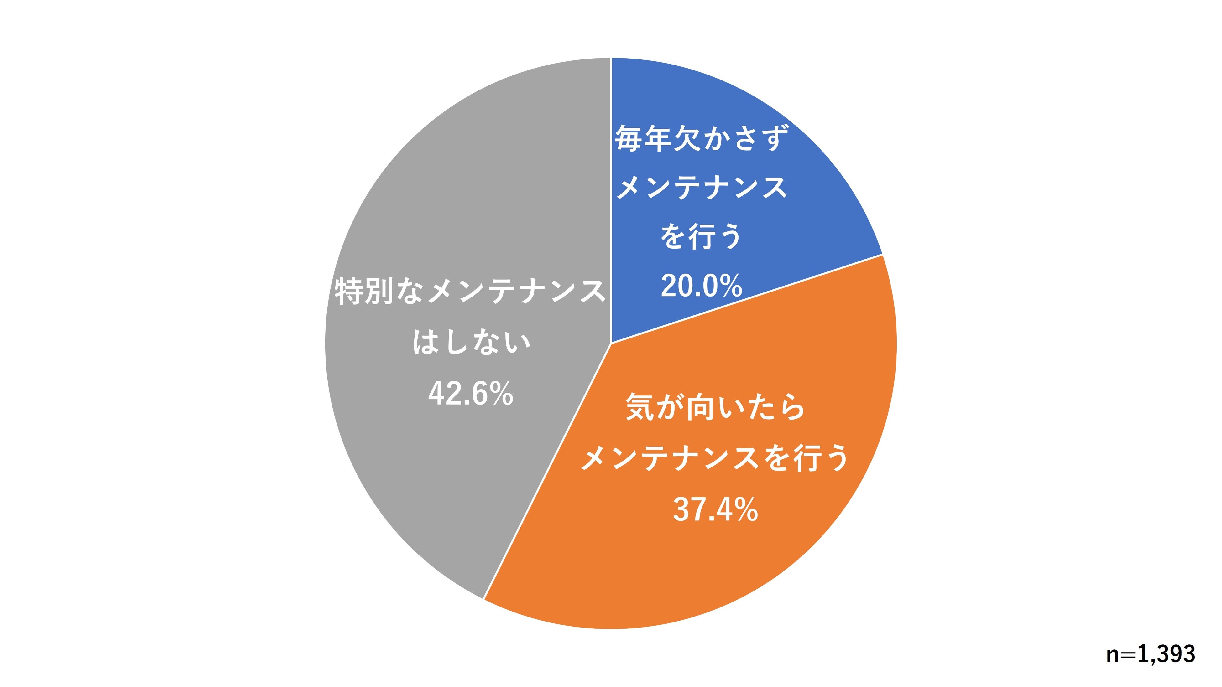 さらに「普段運転する車を自分でメンテナンスしている」と回答した人へ、梅雨の時期が来る前に、雨天時に備えたメンテナンスを行うか質問したところ、「毎年欠かさずメンテナンスを行う(20.0%)」「気が向いたらメンテナンスを行う(37.4%)」となり、合計で57.4%の人が梅雨時期前のメンテナンスへの意識を持ち、実施していることがわかりました。