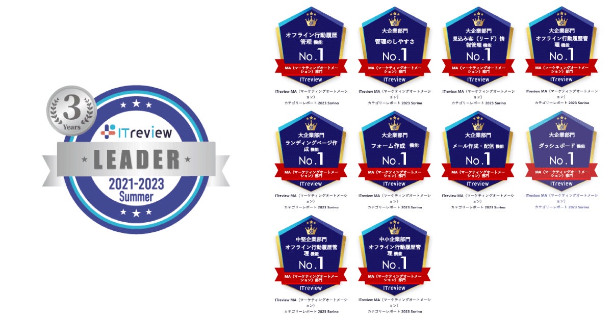 MA部門は15期(3年9か月)連続、イベント管理部門は16期(4年)連続の受賞となり、両部門とも3年連続LEADERバッジを取得し殿堂入りを果たしております。また、MA部門のすべての部門において、オフライン行動履歴管理機能でNo.1を獲得したほか、大企業部門では全7項目でNo.1を獲得(管理のしやすさ機能、見込み客(リード)情報管理機能、ランディングページ作成機能、フォーム作成機能、メール作成・配信機能、ダッシュボード機能)しています。