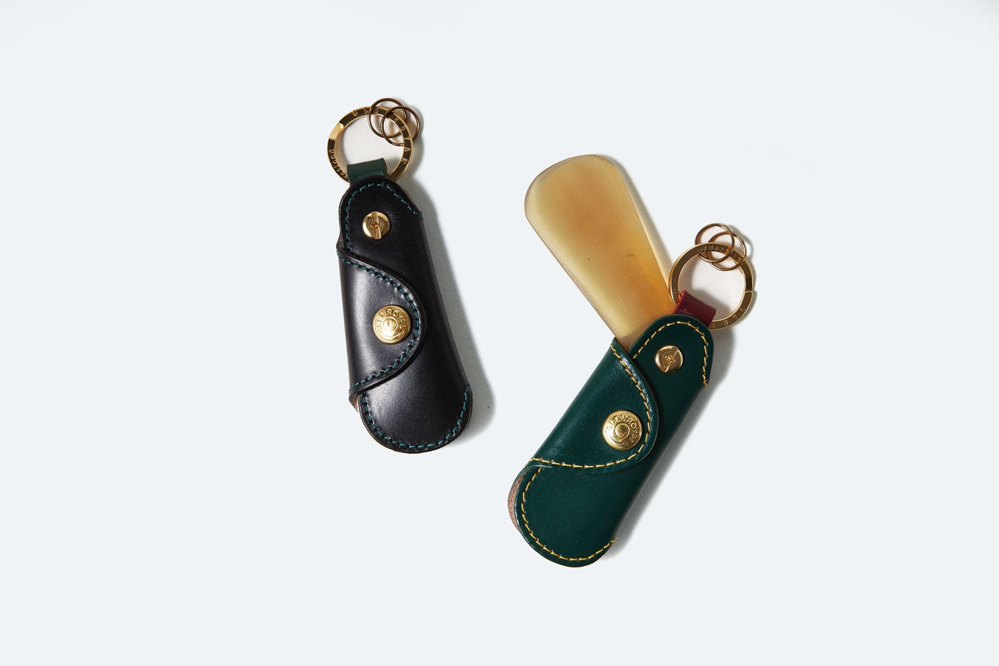 靴を大切に扱いたい方の必需品である靴べらをブライドルレザーで包んだ定番アイテム。手のひらに収まりやすく、キーリングも付属しているので、鍵などと一緒に持ち運びもしやすく普段使いに最適です。思わぬところで靴を脱ぎ履きする場面に出くわしたら、サッと取り出して使える便利な逸品です。