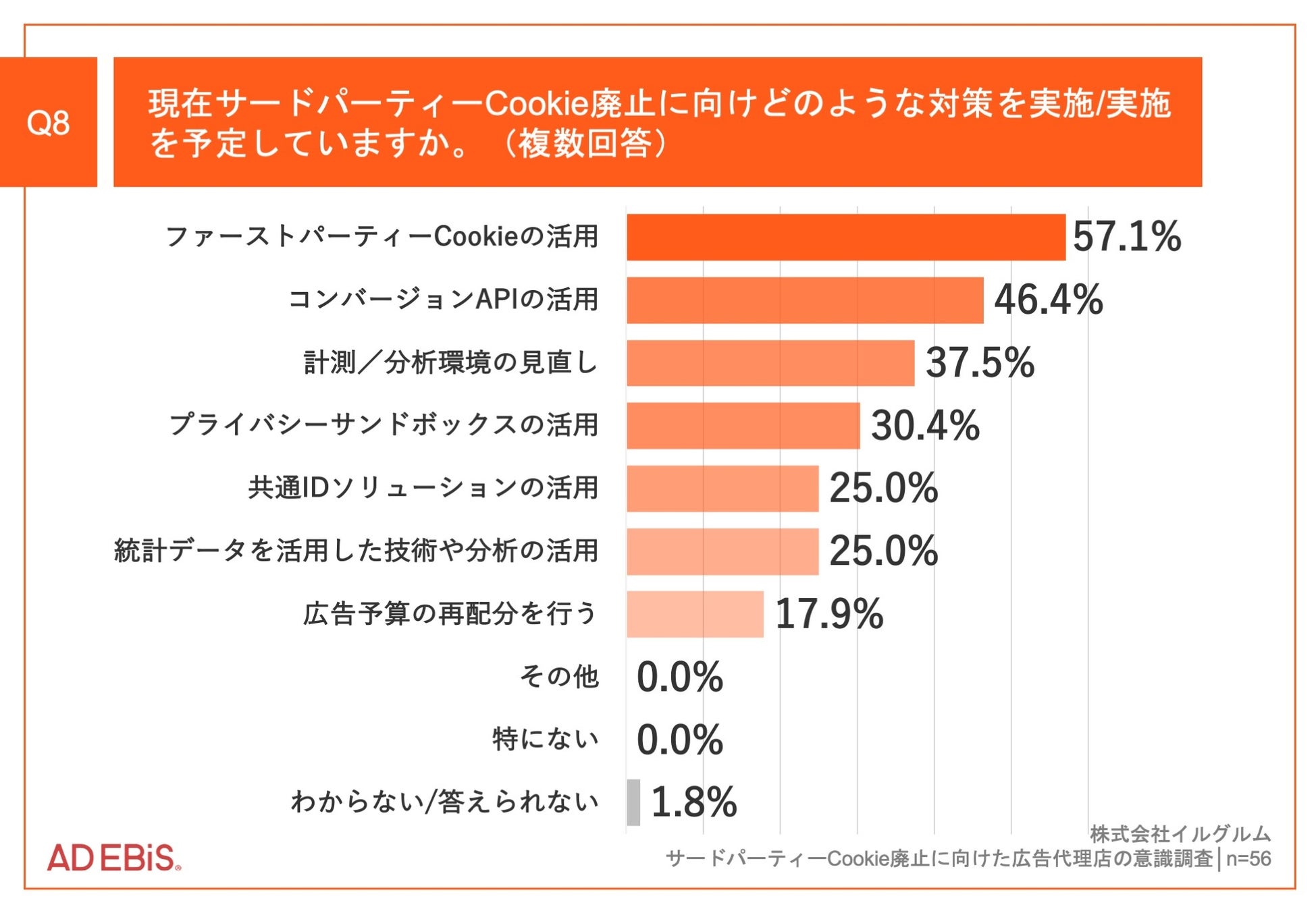 「Q7.あなたは、現在Chromeのサードパーティー廃止に向けた提案を提案していますか」(n=201)で「提案している」27.9%と回答した方に、「Q8.現在サードパーティーCookie廃止に向けどのような対策を実施していますか(複数回答)」(n=56)と質問したところ、「ファーストパーティーCookie の活用」が57.1%、「コンバージョンAPI の活用」が46.4%、「計測/分析環境の見直し」が37.5%という回答となりました。