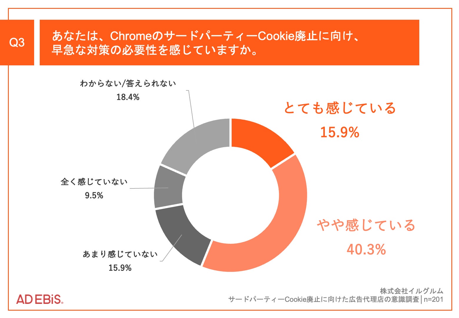 「Q3.あなたは、ChromeのサードパーティーCookie廃止に向け、早急な対策の必要性を感じていますか。」(n=201)と質問したところ、「とても感じている」が15.9%、「やや感じている」が40.3%という回答となりました。