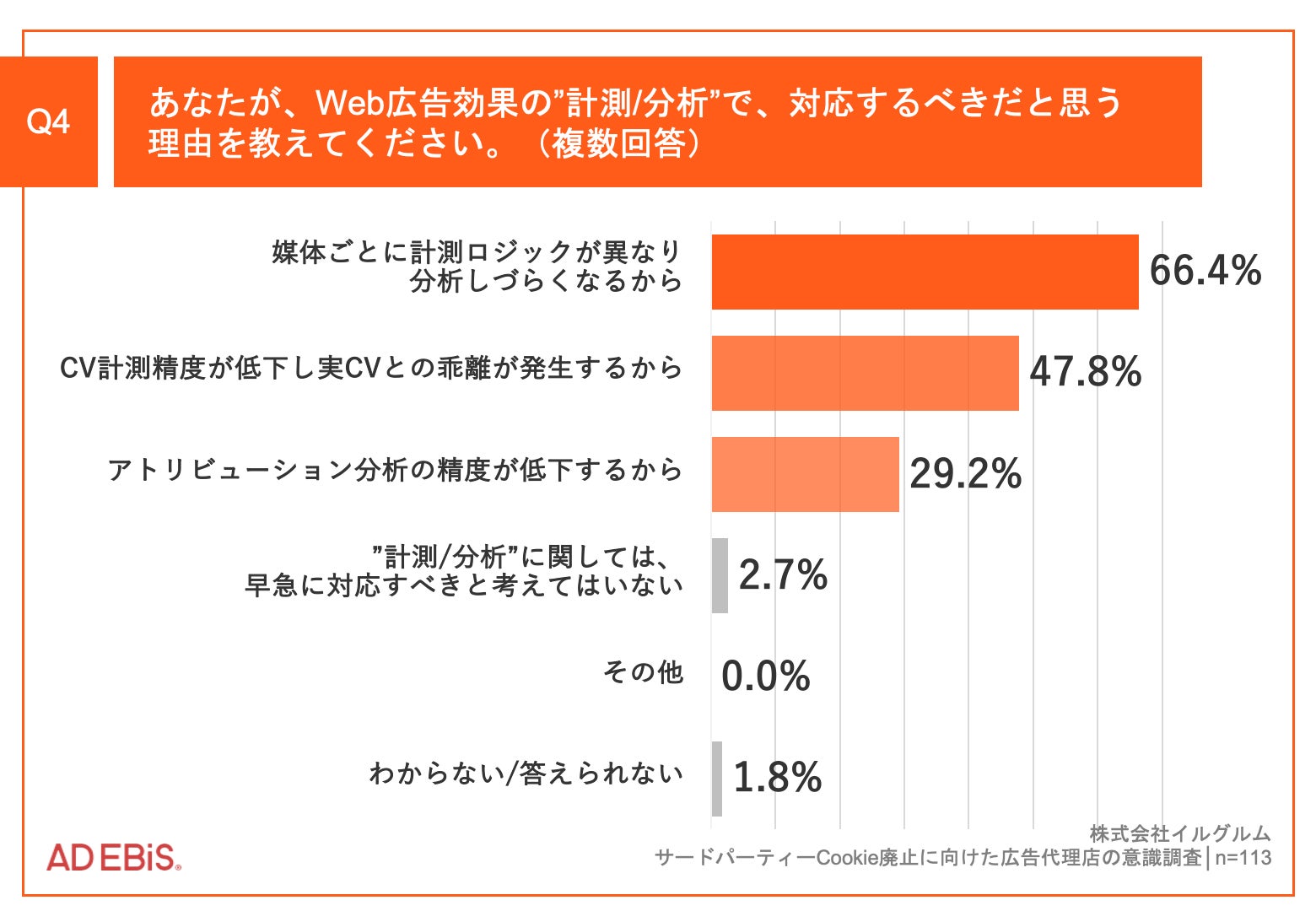 Q3で「とても感じている」「やや感じている」と回答した方に、「Q4.あなたが、Web 広告効果の”計測/分析”で、対応するべきだと思う理由を教えてください。(複数回答)」(n=113)と質問したところ、「媒体ごとに計測ロジックが異なり分析しづらくなるから」が66.4%、「CV計測精度が低下し実CVとの乖離が発生するから」が47.8%、