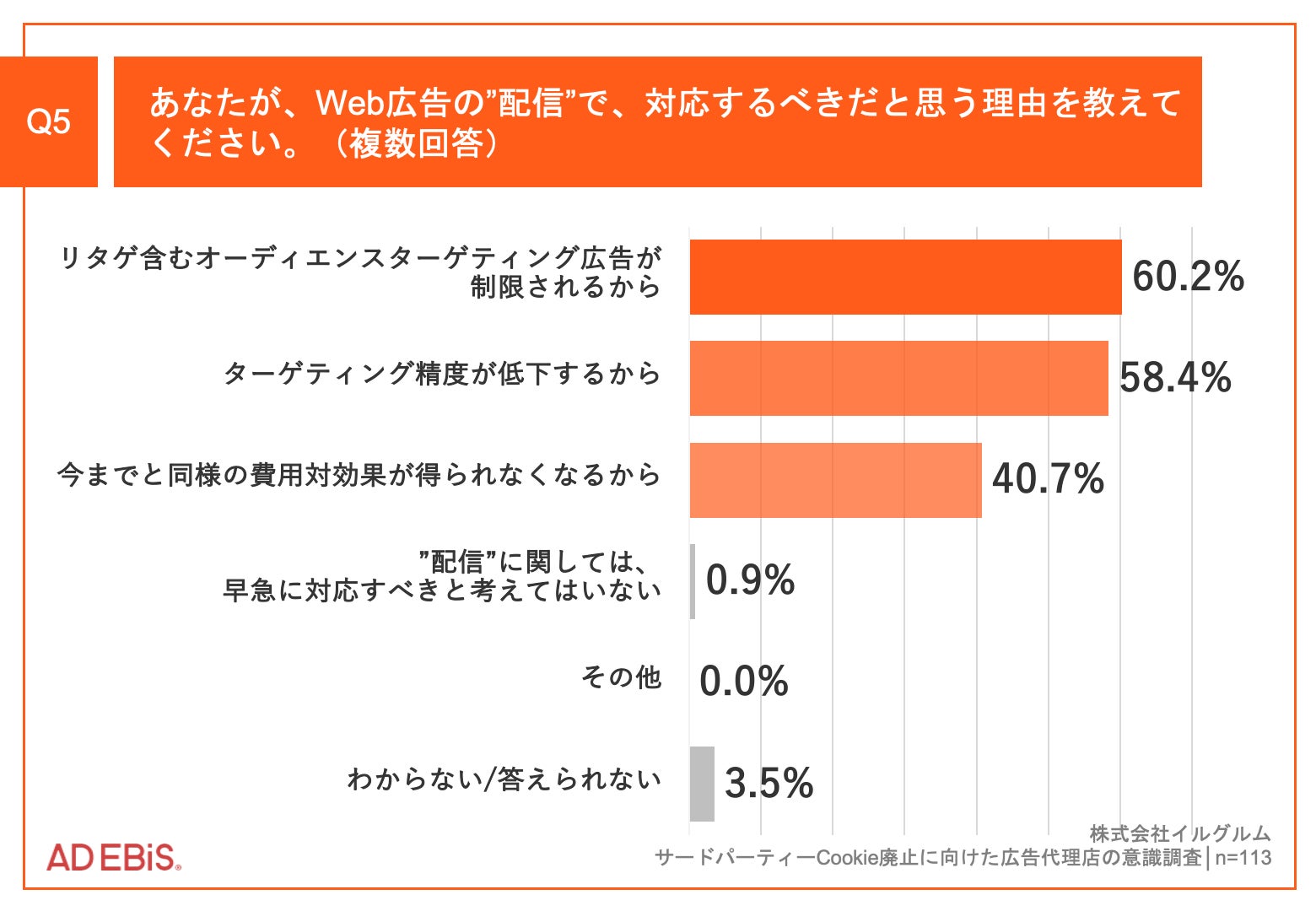 Q3 で「とても感じている」「やや感じている」と回答した方に、「Q5.あなたが、Web 広告の”配信”で、対応するべきだと思う理由を教えてください。(複数回答)」(n=113)と質問したところ、「リタゲ含むオーディエンスターゲティング広告が制限されるから」が60.2%、「ターゲティング精度が低下するから」が58.4%、「今までと同様の費用対効果が得られなくなるから」が40.7%という回答となりました。