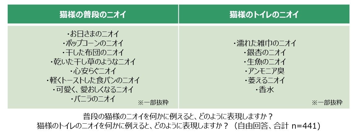 愛猫家に猫様にまつわるニオイを何かに例えてもらったところ、普段の猫様のニオイとしては、「お日さまのニオイ」「ポップコーンのニオイ」「干した布団のニオイ」が多く、ほかにも「バニラのニオイ」「軽くトーストした食パンのニオイ」などユニークな回答が上がりました。昨今では「猫吸い」という、飼い主が猫様の体に顔をうずめてニオイをかぐ行為がSNSを中心に話題になっています。普段の猫様は、お日さま、甘いバニラ、香ばしいトーストといった癒しや幸せを感じるニオイのため、「猫吸い」にハマる飼い主も多いことが推測できます。一方で、猫様のトイレのニオイとしては「濡れた雑巾のニオイ」「生魚のニオイ」に例える人が多く、全体的に、鼻をつんと刺すような生臭さを感じていることが分かりました。