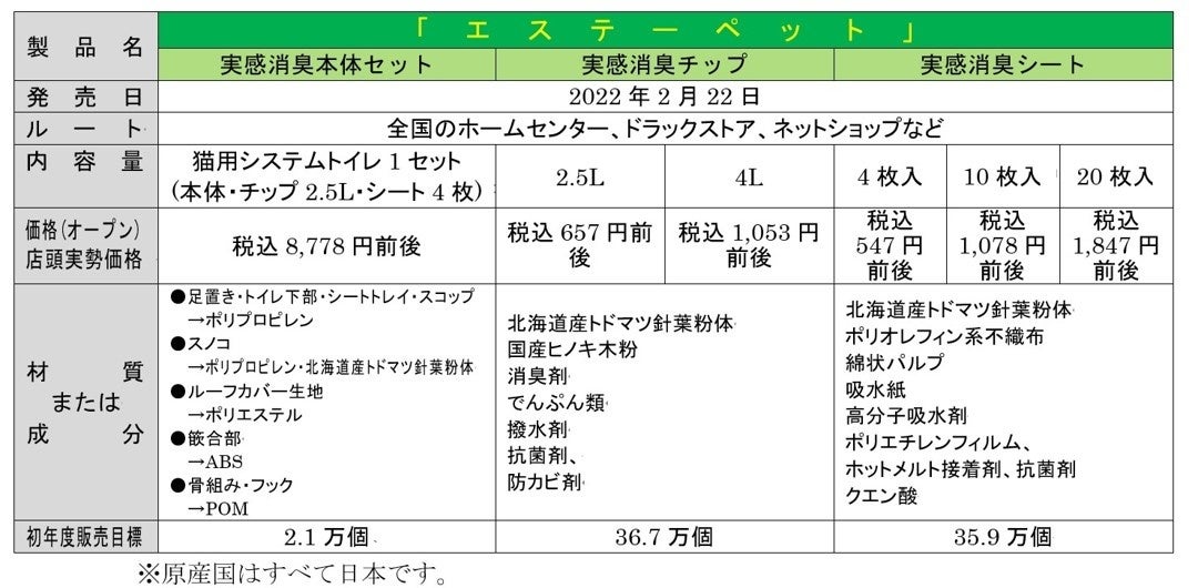 当社は、新ブランドの「エステーペット」を立ち上げ、「ねこの日」である2022年2月22日に、第一弾となる猫用システムトイレ「エステーペット 実感消臭本体セット」、「エステーペット 実感消臭チップ(2アイテム)」、「エステーペット 実感消臭シート(3アイテム)」を新発売します。トイレのニオイの不満が顕在化している愛猫の飼い主様に向けて、問題解決となる猫用システムトイレの商品を提供し、ニオイの気にならない快適な生活の実現を目指してまいります。