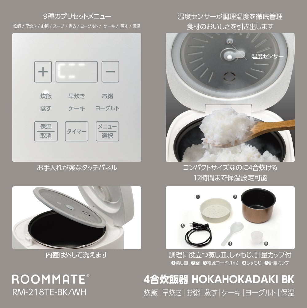 ダイアモンドヘッド株式会社「ブランド名:ROOMMATE®(ルームメイト)」は、「ROOMMATE® 4合炊飯器 HOKAHOKADAKI RM-218TE」を発売しました。