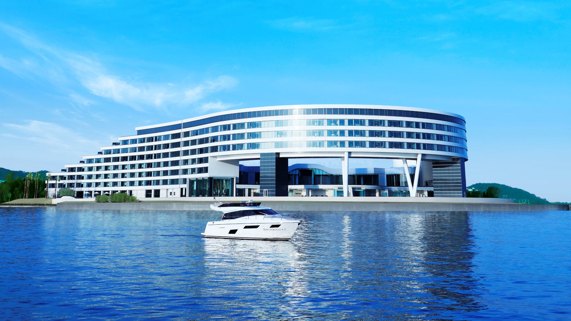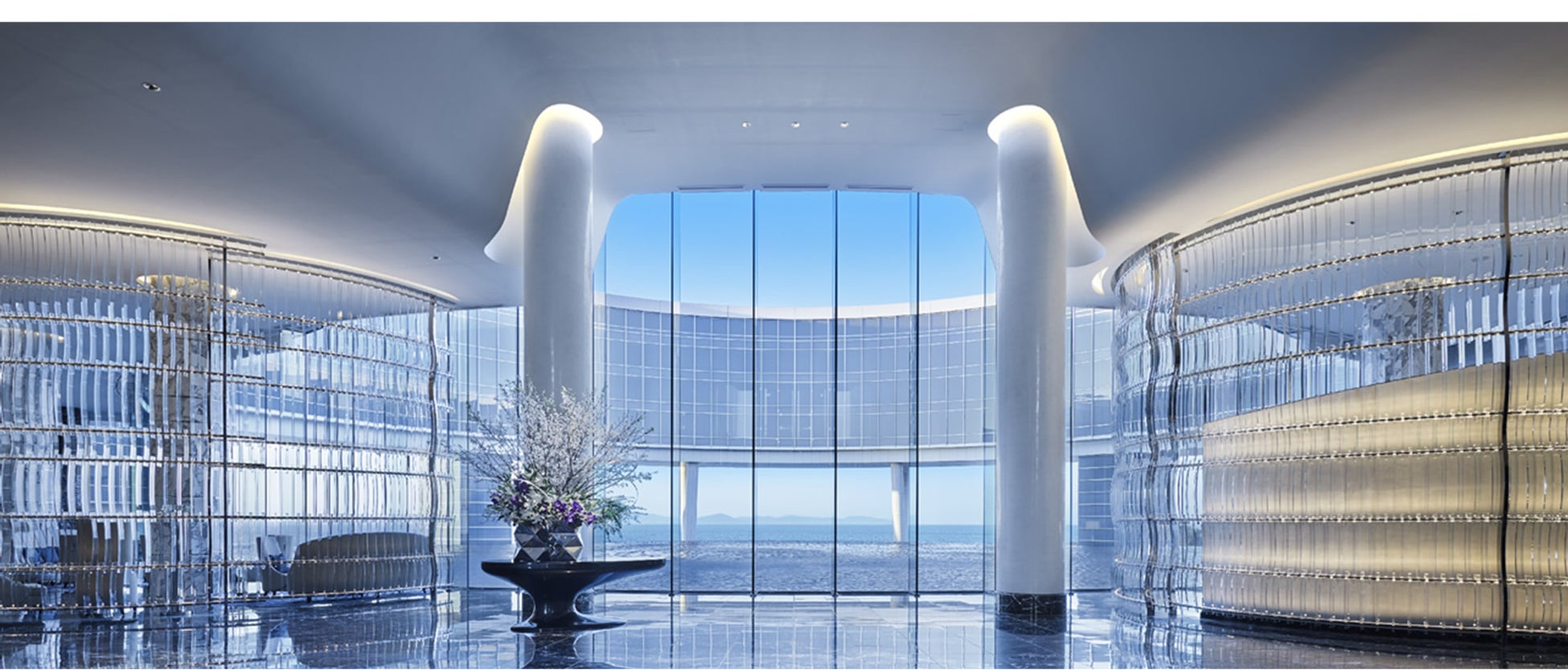 2019年3月に開業した完全会員制リゾートホテル。海岸線に沿って描かれた「波」のような曲線と、海に向かって大きく突き出たダイナミックなフォルムが印象的な外観は、“Futuristic Luxury(フューチャリスティックラグジュアリー)”をデザインコンセプトに、素材やインテリアも煌くような光沢感にこだわり、近未来のラグジュアリーな空間で、訪れた方に非日常を提供しています。