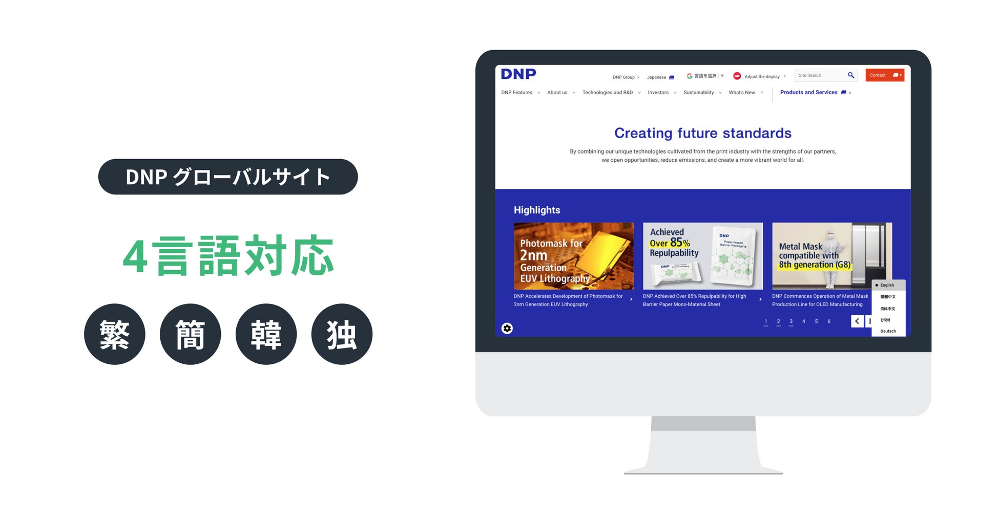 WOVN.io をDNP のグローバルサイトに導入し、英語を元言語に4言語へ対応しております。