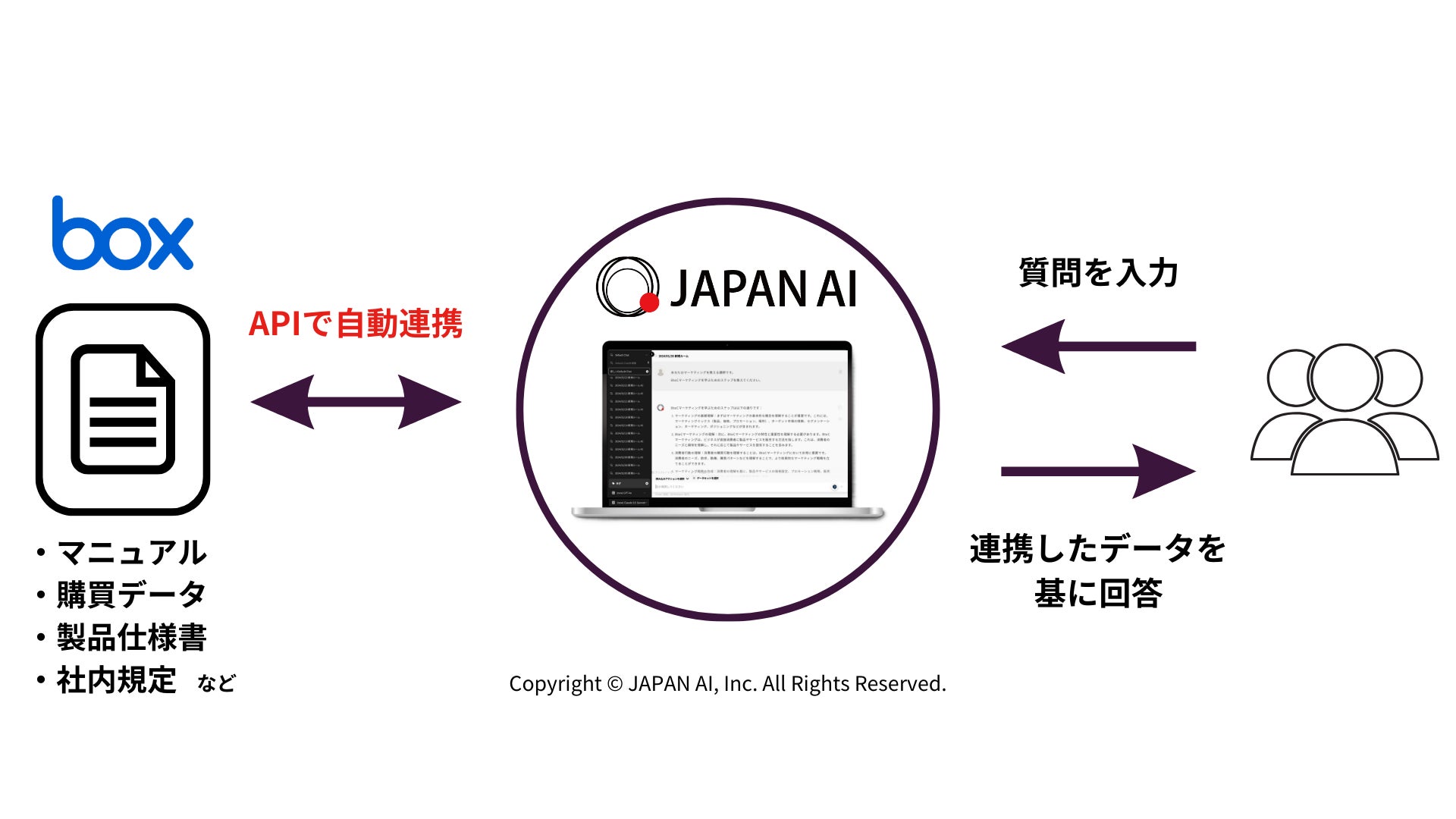このような背景のもと、JAPAN AIは大企業から中小企業までより多くの企業が生成AIを活用できるように、社内データをセキュアに管理できるストレージサービスである「Box」との連携を実現しました。