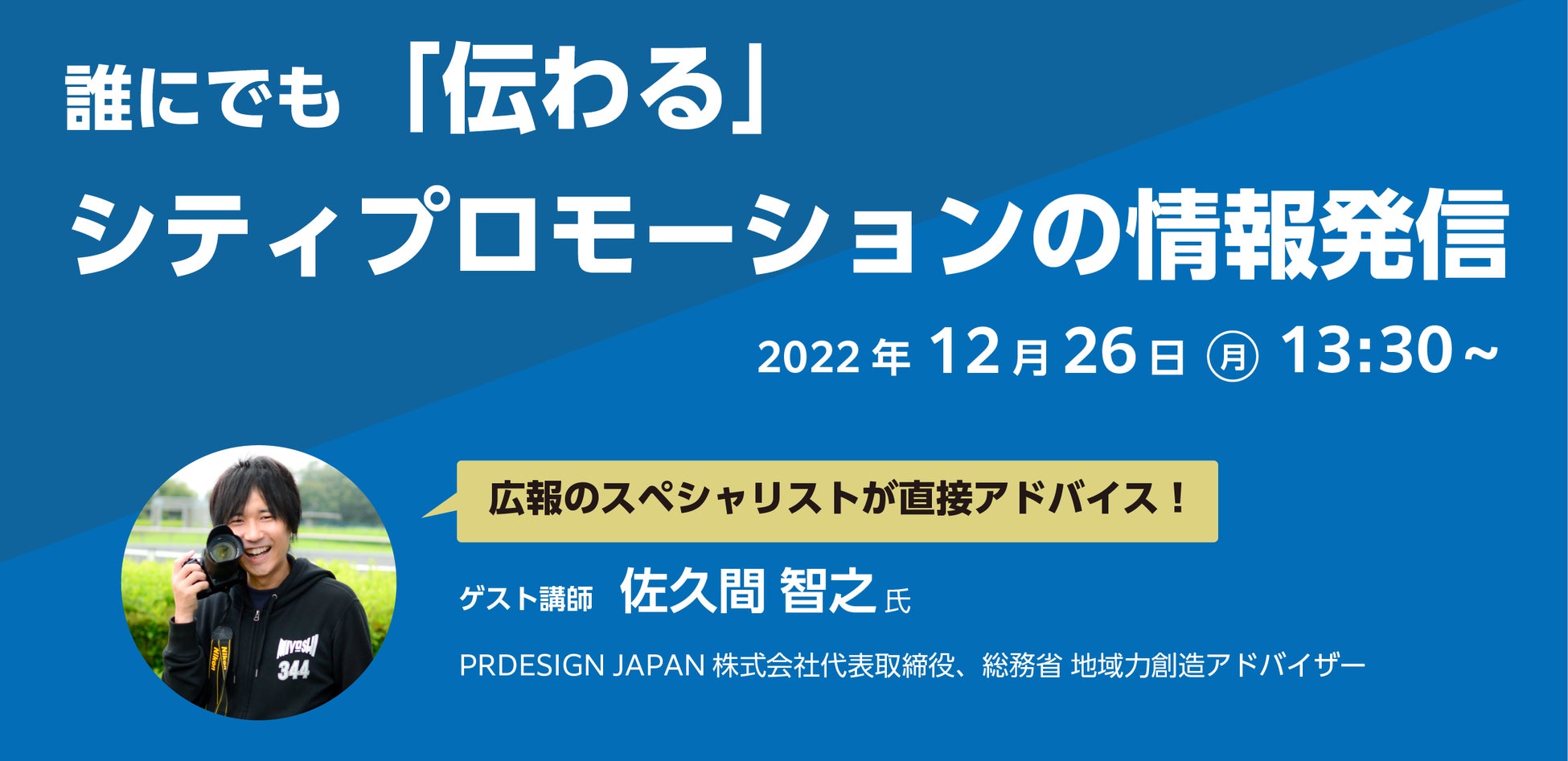 地域の活性化と維持を目的とするシティプロモーションは、SDGsにも深く関わる取り組みとして注目されています。子育て中の人や高齢者、障害がある人、在留外国人など、さまざまな地域住民に対して、自治体の広報担当者はその地域の魅力を伝え、地元への愛着度を上げるための積極的な働きかけが求められています。本セミナーでは、広報担当者が行うシティプロモーションの取り組み方を、全国の自治体広報活動を知り尽くした佐久間氏が解説。当日は、受講者からの質問にもフレキシブルにお答えします。